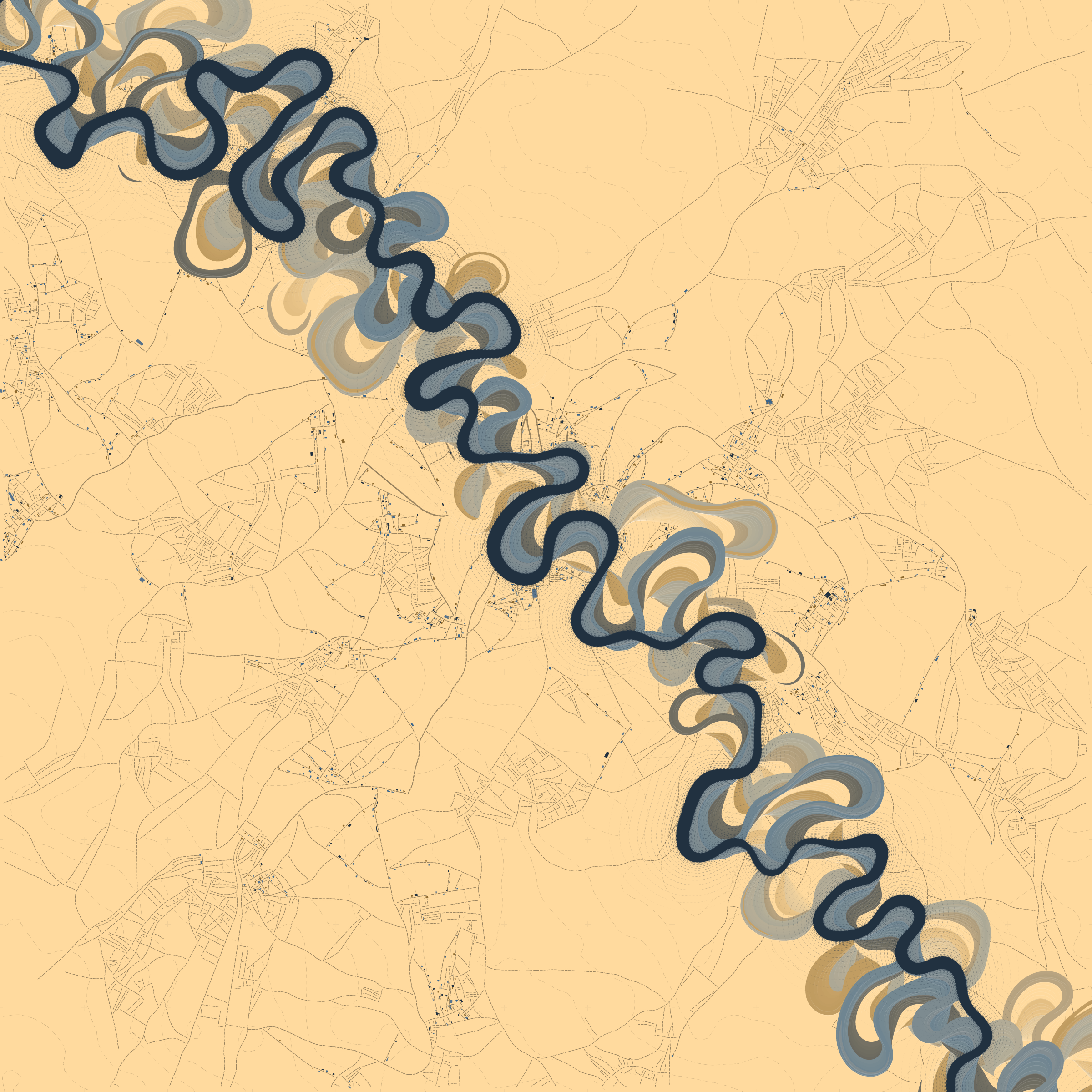 Ancient Courses is a generative experience that explores the aesthetics of meandering rivers and the settlements that form on their banks. The design is graphic and cartographic with bold color palettes rendered against map iconography and line sensibility. From the river banks, roads stretch across the landscape: sometimes a single access road, other times sprawling towns. The river meandering is simulated via a custom algorithm which closely models the real world process.