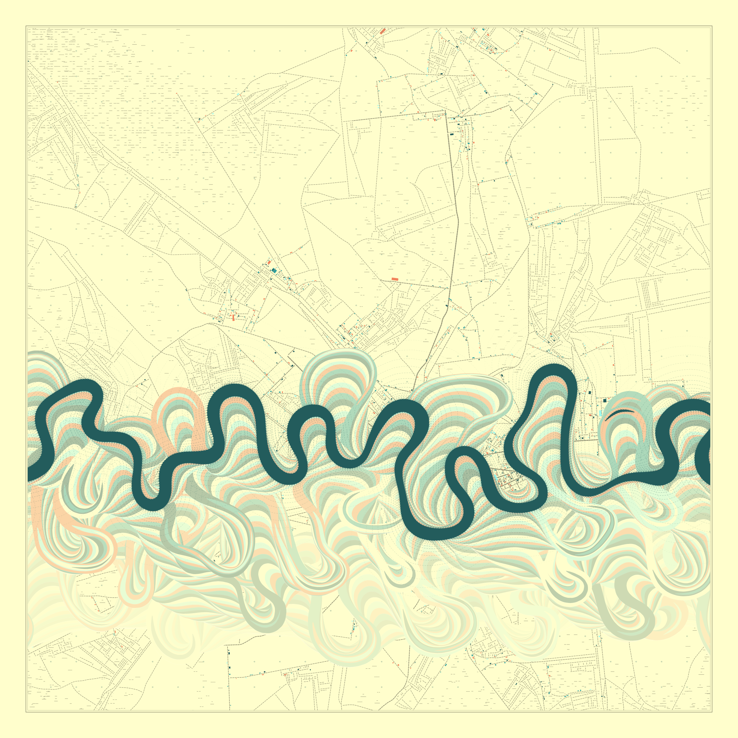 Ancient Courses is a generative experience that explores the aesthetics of meandering rivers and the settlements that form on their banks. The design is graphic and cartographic with bold color palettes rendered against map iconography and line sensibility. From the river banks, roads stretch across the landscape: sometimes a single access road, other times sprawling towns. The river meandering is simulated via a custom algorithm which closely models the real world process.