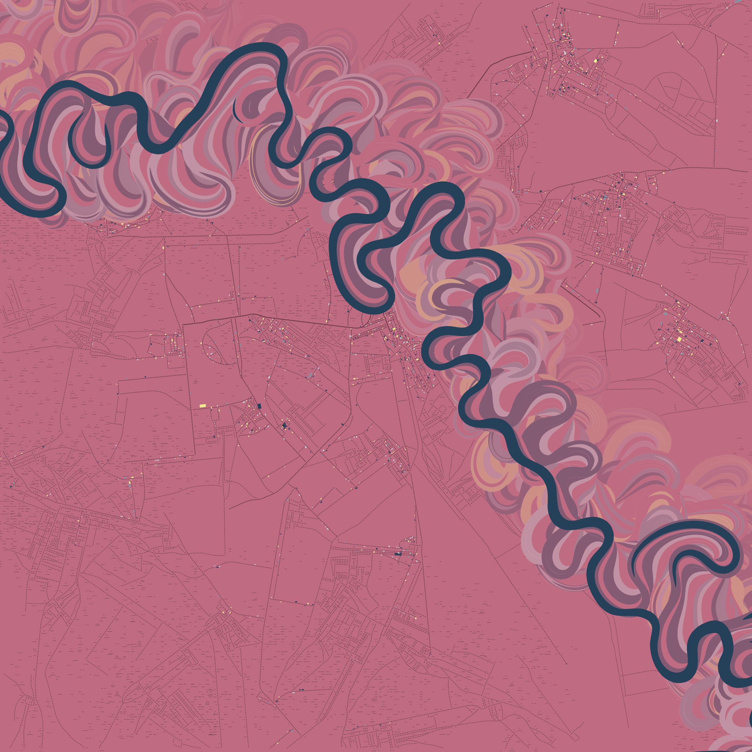Ancient Courses is a generative experience that explores the aesthetics of meandering rivers and the settlements that form on their banks. The design is graphic and cartographic with bold color palettes rendered against map iconography and line sensibility. From the river banks, roads stretch across the landscape: sometimes a single access road, other times sprawling towns. The river meandering is simulated via a custom algorithm which closely models the real world process.