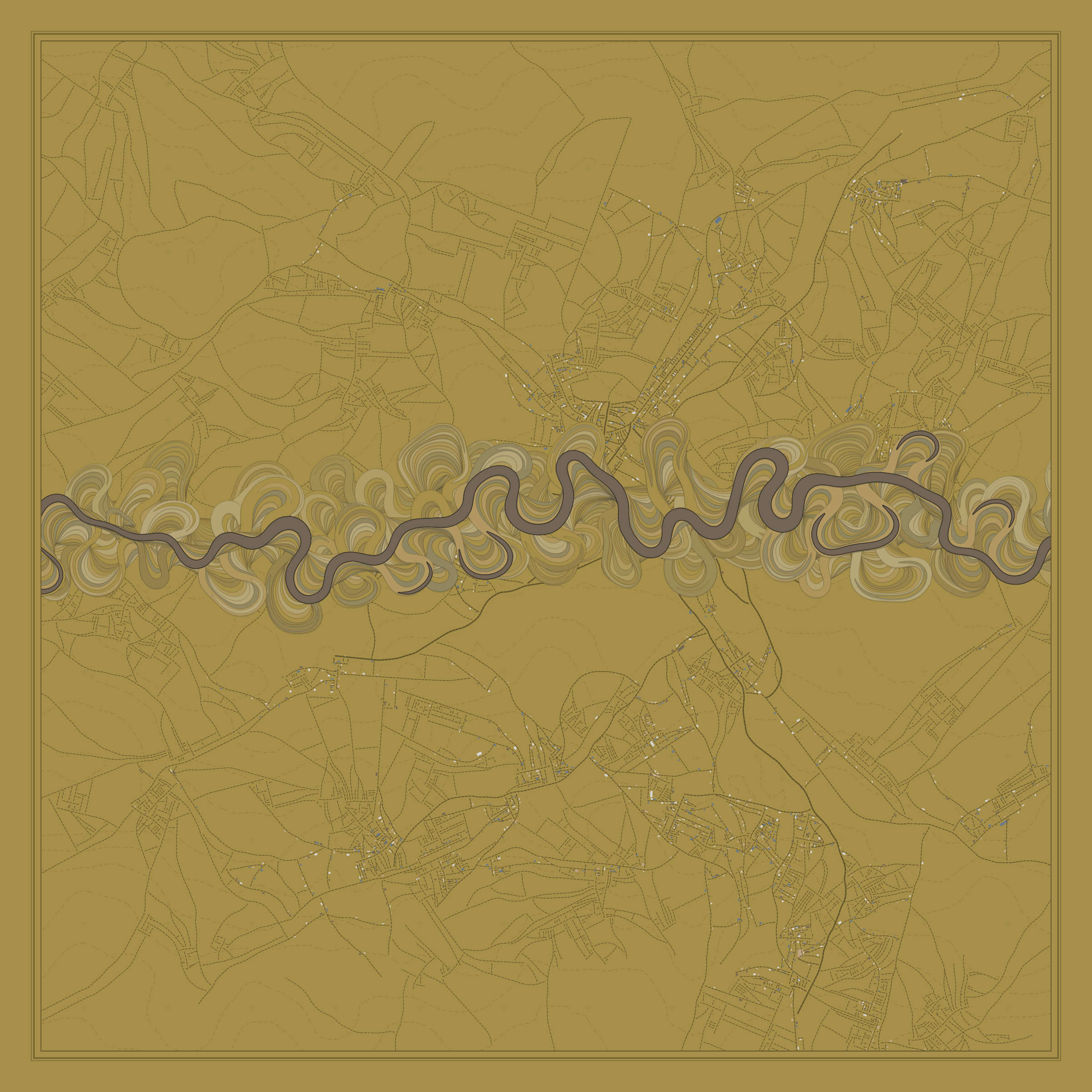 Ancient Courses is a generative experience that explores the aesthetics of meandering rivers and the settlements that form on their banks. The design is graphic and cartographic with bold color palettes rendered against map iconography and line sensibility. From the river banks, roads stretch across the landscape: sometimes a single access road, other times sprawling towns. The river meandering is simulated via a custom algorithm which closely models the real world process.