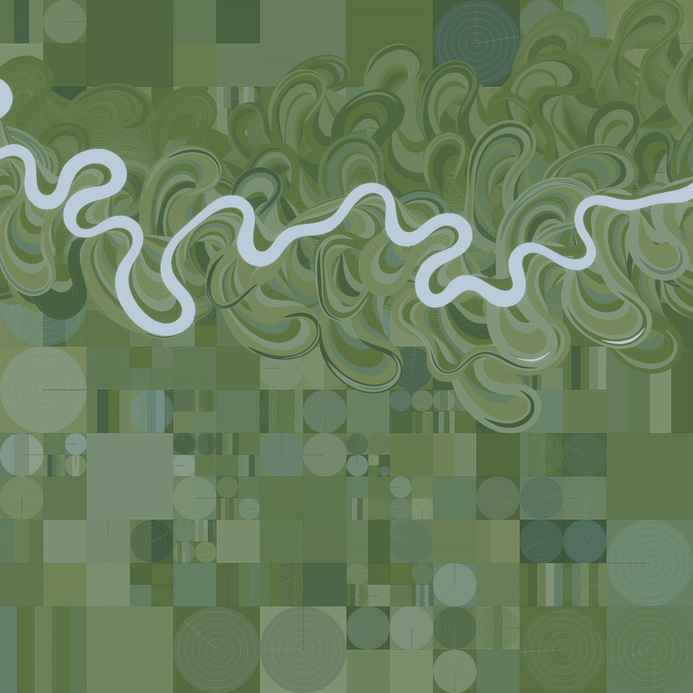 Ancient Courses is a generative experience that explores the aesthetics of meandering rivers and the settlements that form on their banks. The design is graphic and cartographic with bold color palettes rendered against map iconography and line sensibility. From the river banks, roads stretch across the landscape: sometimes a single access road, other times sprawling towns. The river meandering is simulated via a custom algorithm which closely models the real world process.
