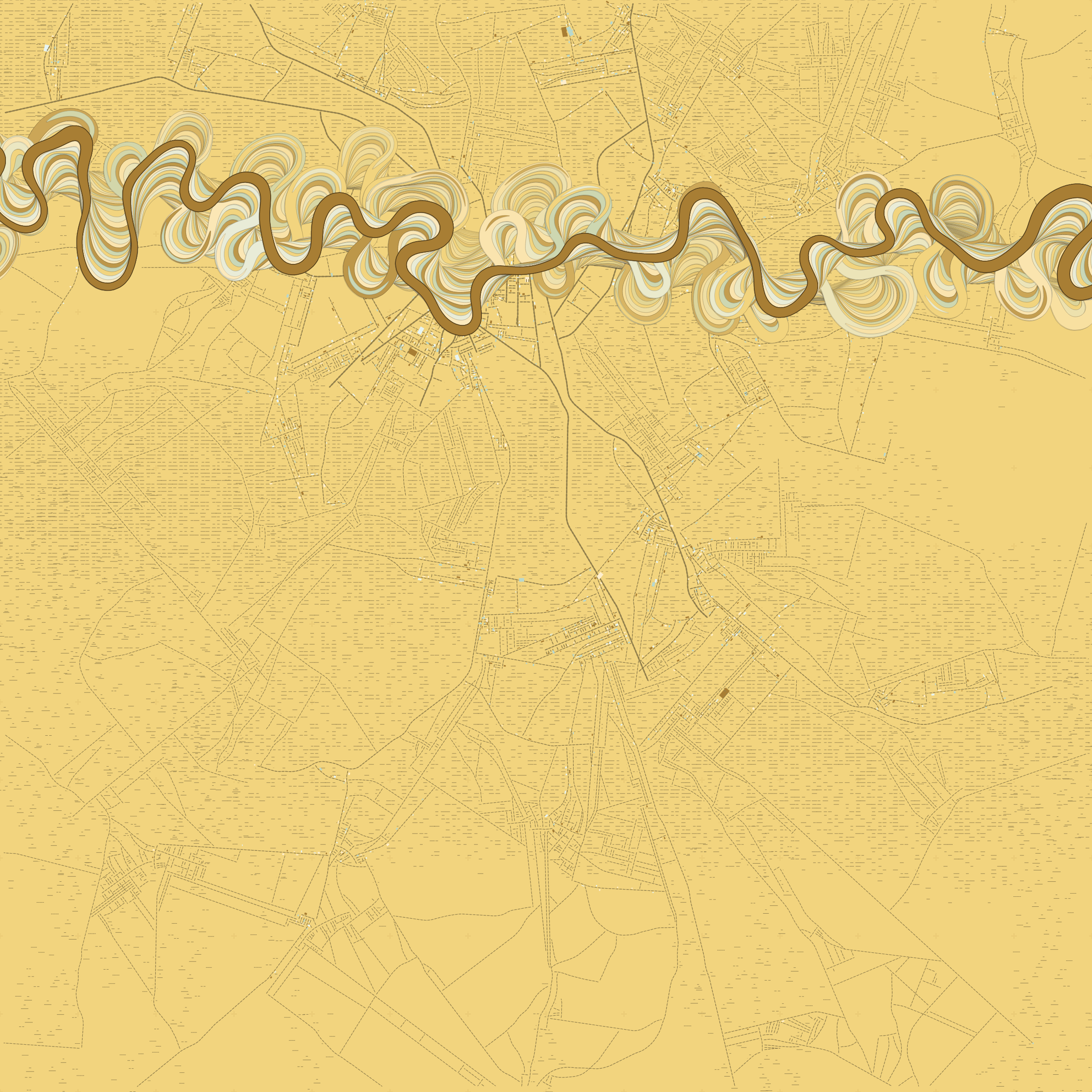 Ancient Courses is a generative experience that explores the aesthetics of meandering rivers and the settlements that form on their banks. The design is graphic and cartographic with bold color palettes rendered against map iconography and line sensibility. From the river banks, roads stretch across the landscape: sometimes a single access road, other times sprawling towns. The river meandering is simulated via a custom algorithm which closely models the real world process.