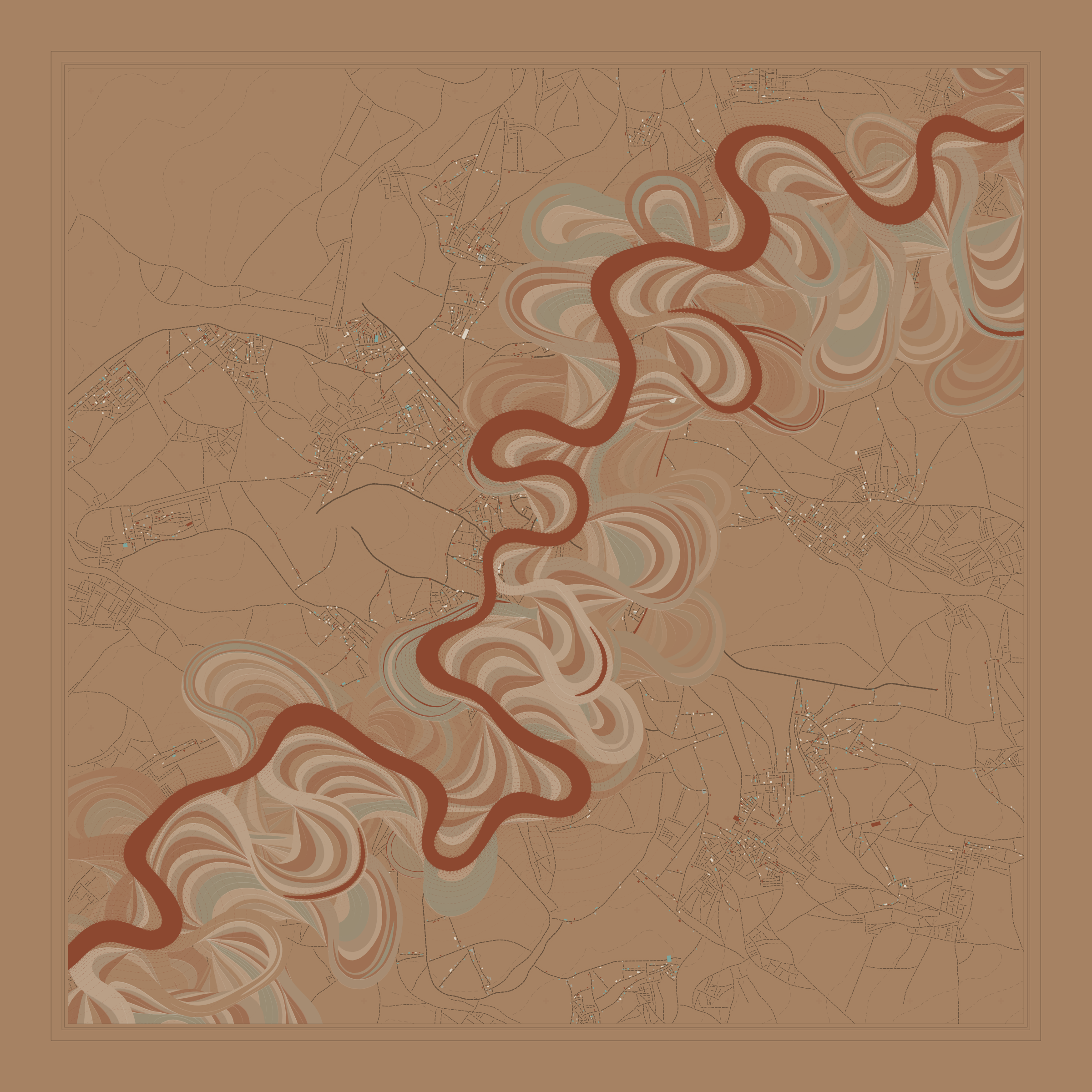 Ancient Courses is a generative experience that explores the aesthetics of meandering rivers and the settlements that form on their banks. The design is graphic and cartographic with bold color palettes rendered against map iconography and line sensibility. From the river banks, roads stretch across the landscape: sometimes a single access road, other times sprawling towns. The river meandering is simulated via a custom algorithm which closely models the real world process.