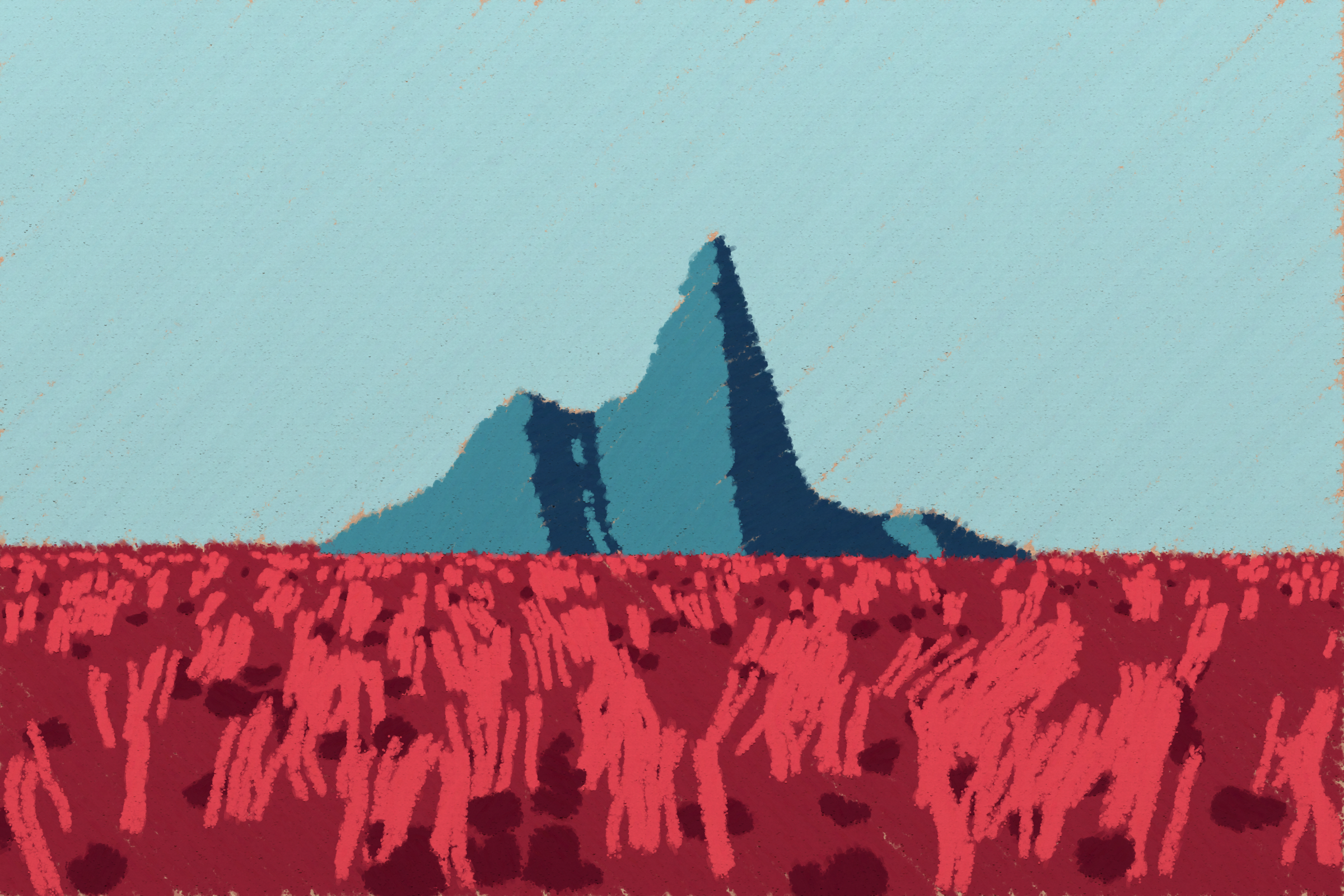 *Arcadia* is a homage to the fridge-worthy landscape art of our youth. Childhood techniques of creating art are re-imagined by the scribbles of a nostalgic, computer-assisted mind.
