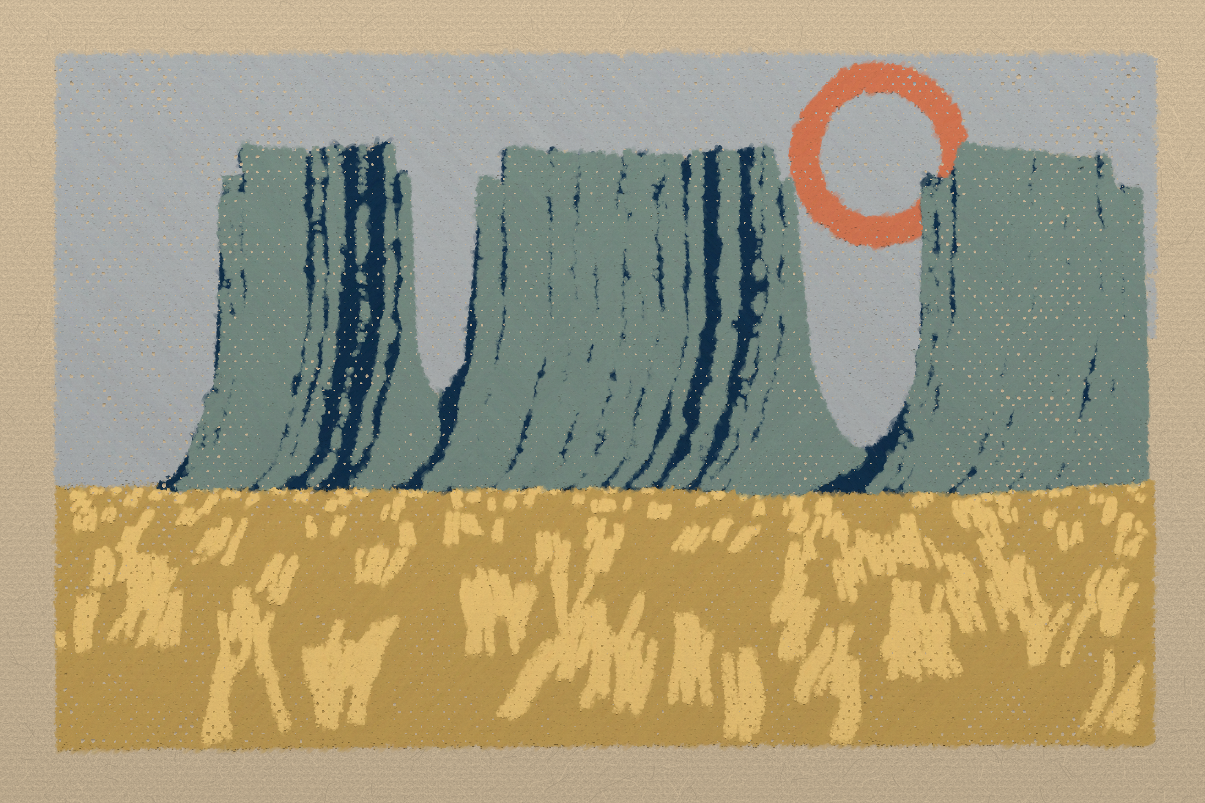 *Arcadia* is a homage to the fridge-worthy landscape art of our youth. Childhood techniques of creating art are re-imagined by the scribbles of a nostalgic, computer-assisted mind.
