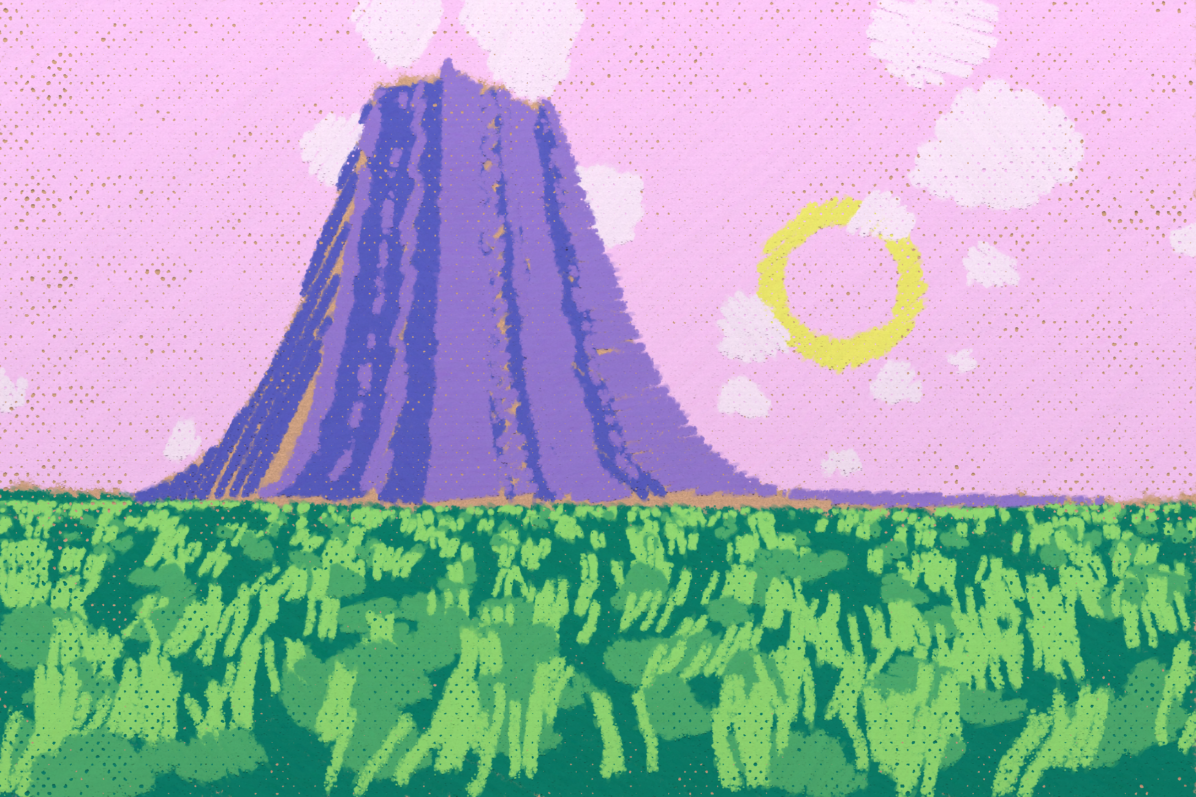*Arcadia* is a homage to the fridge-worthy landscape art of our youth. Childhood techniques of creating art are re-imagined by the scribbles of a nostalgic, computer-assisted mind.