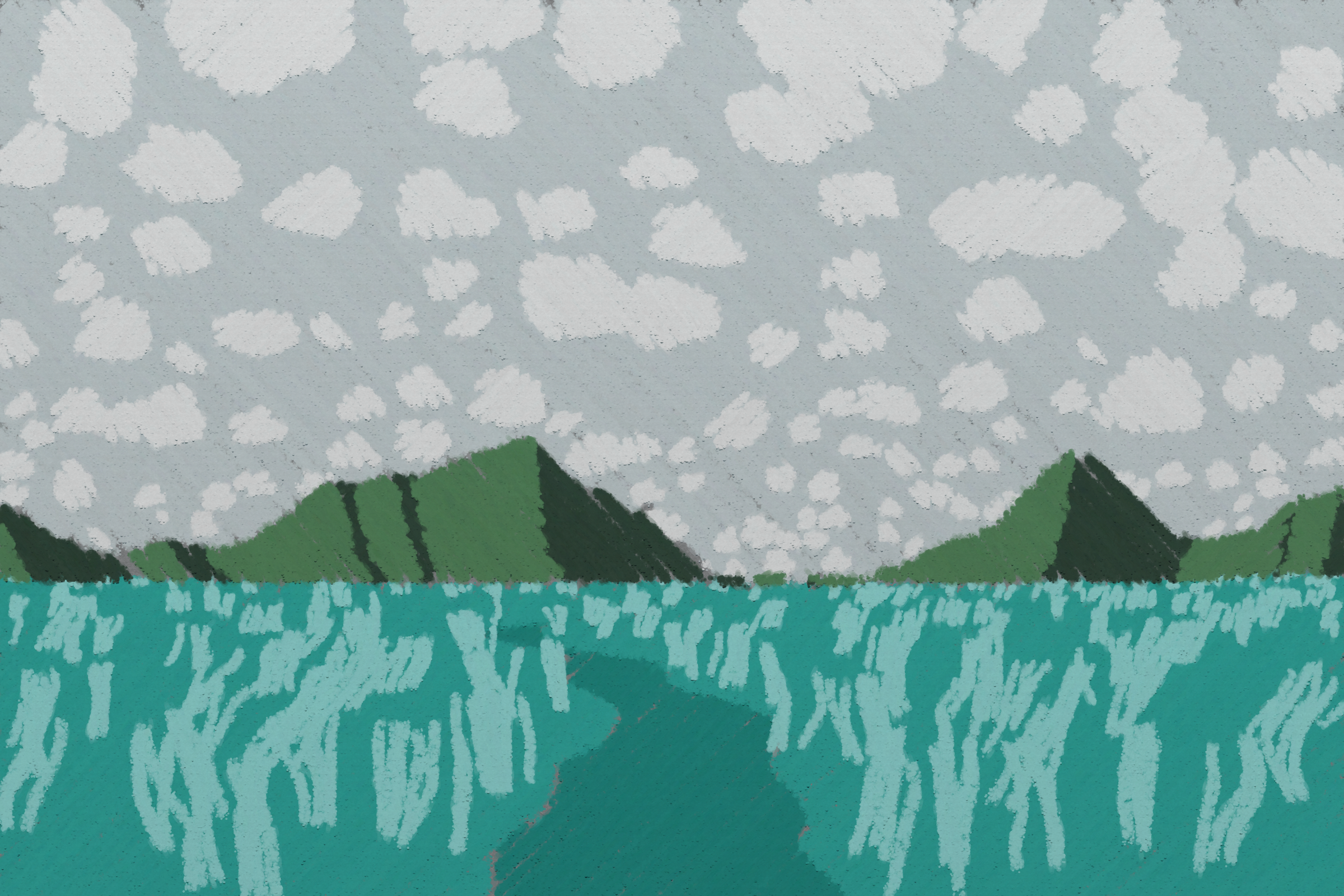 *Arcadia* is a homage to the fridge-worthy landscape art of our youth. Childhood techniques of creating art are re-imagined by the scribbles of a nostalgic, computer-assisted mind.