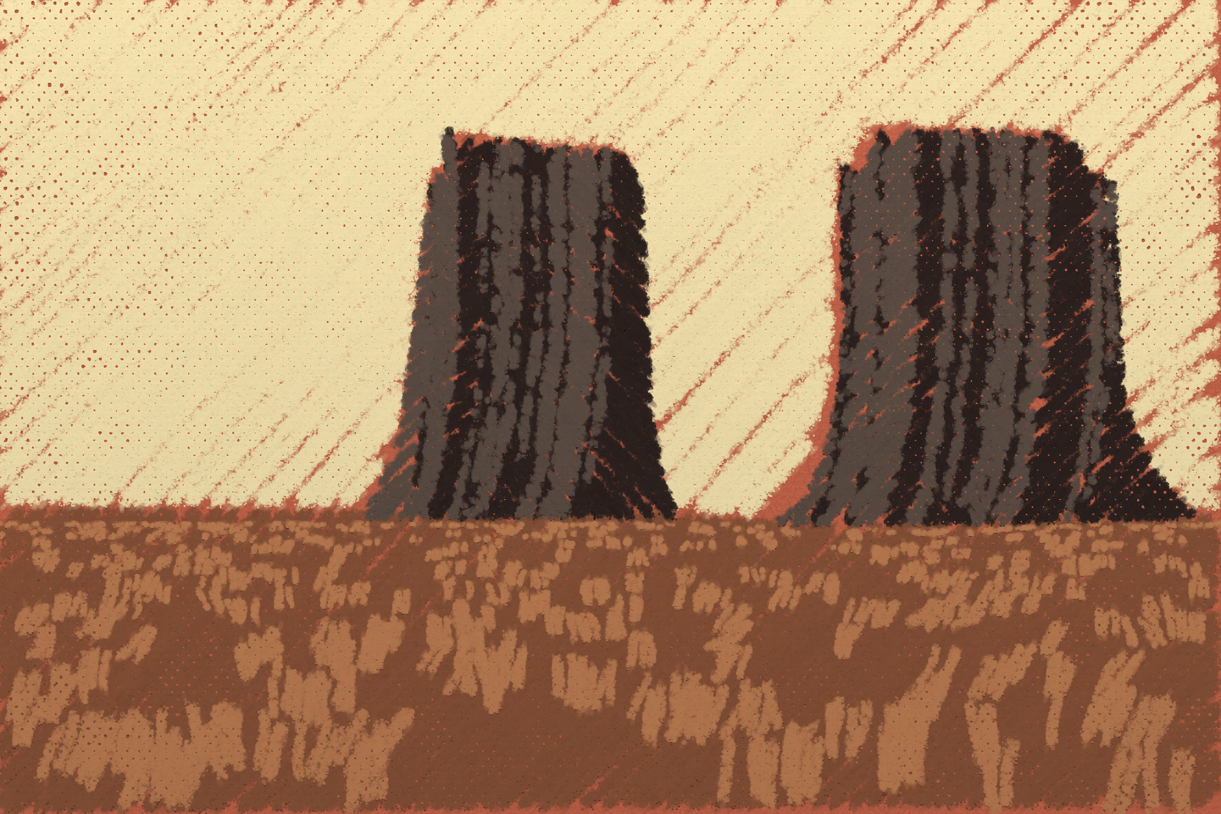*Arcadia* is a homage to the fridge-worthy landscape art of our youth. Childhood techniques of creating art are re-imagined by the scribbles of a nostalgic, computer-assisted mind.
