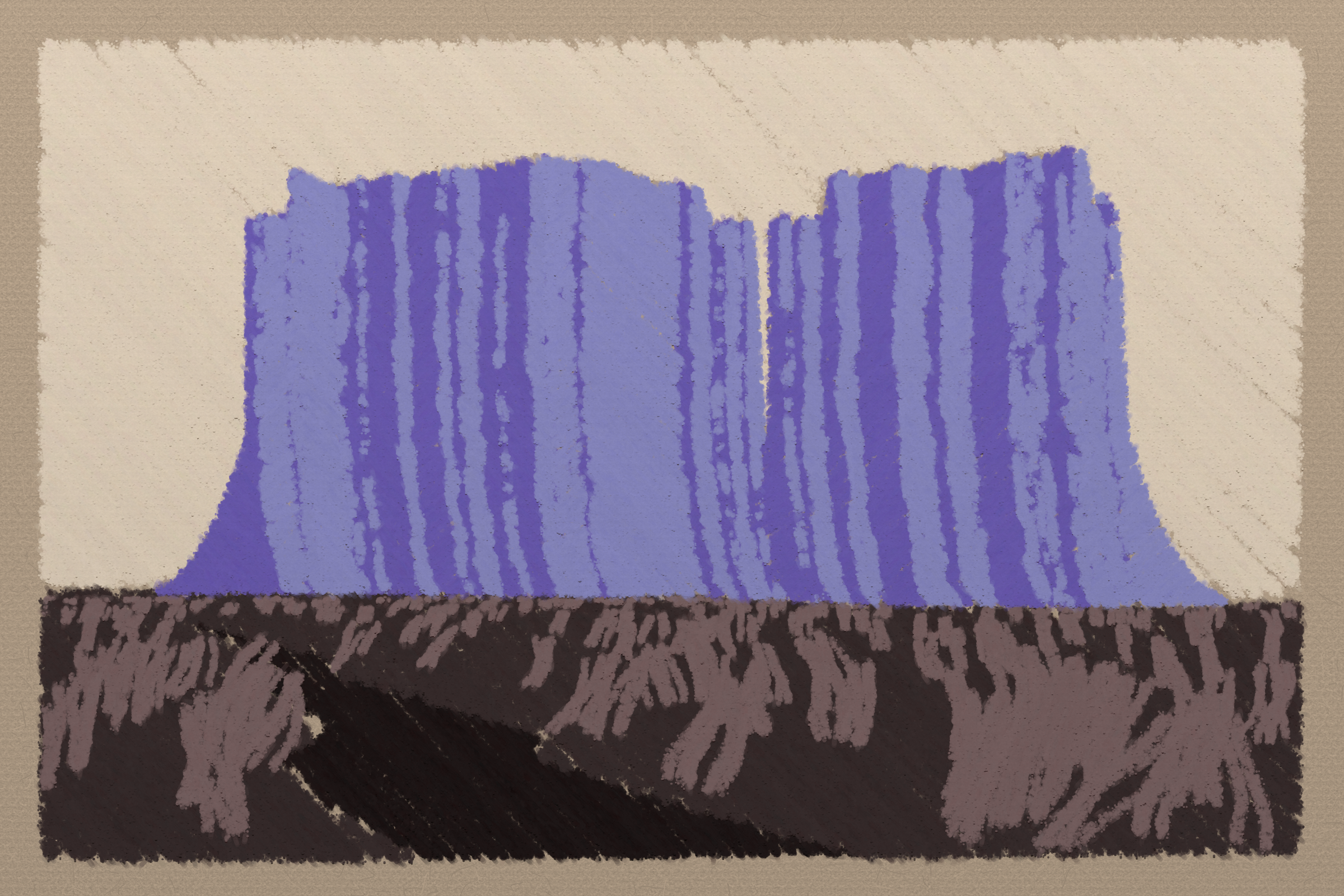 *Arcadia* is a homage to the fridge-worthy landscape art of our youth. Childhood techniques of creating art are re-imagined by the scribbles of a nostalgic, computer-assisted mind.