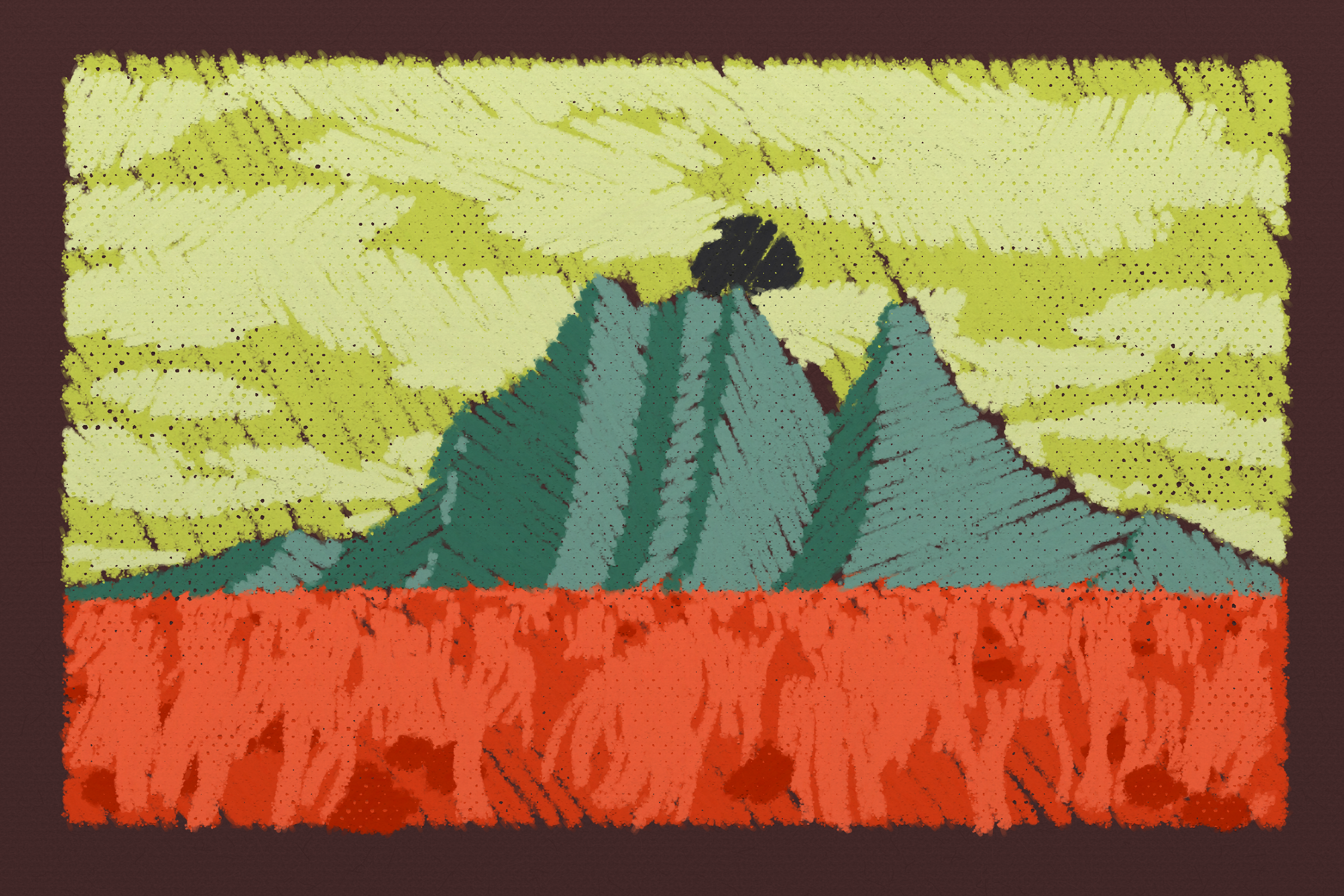 *Arcadia* is a homage to the fridge-worthy landscape art of our youth. Childhood techniques of creating art are re-imagined by the scribbles of a nostalgic, computer-assisted mind.