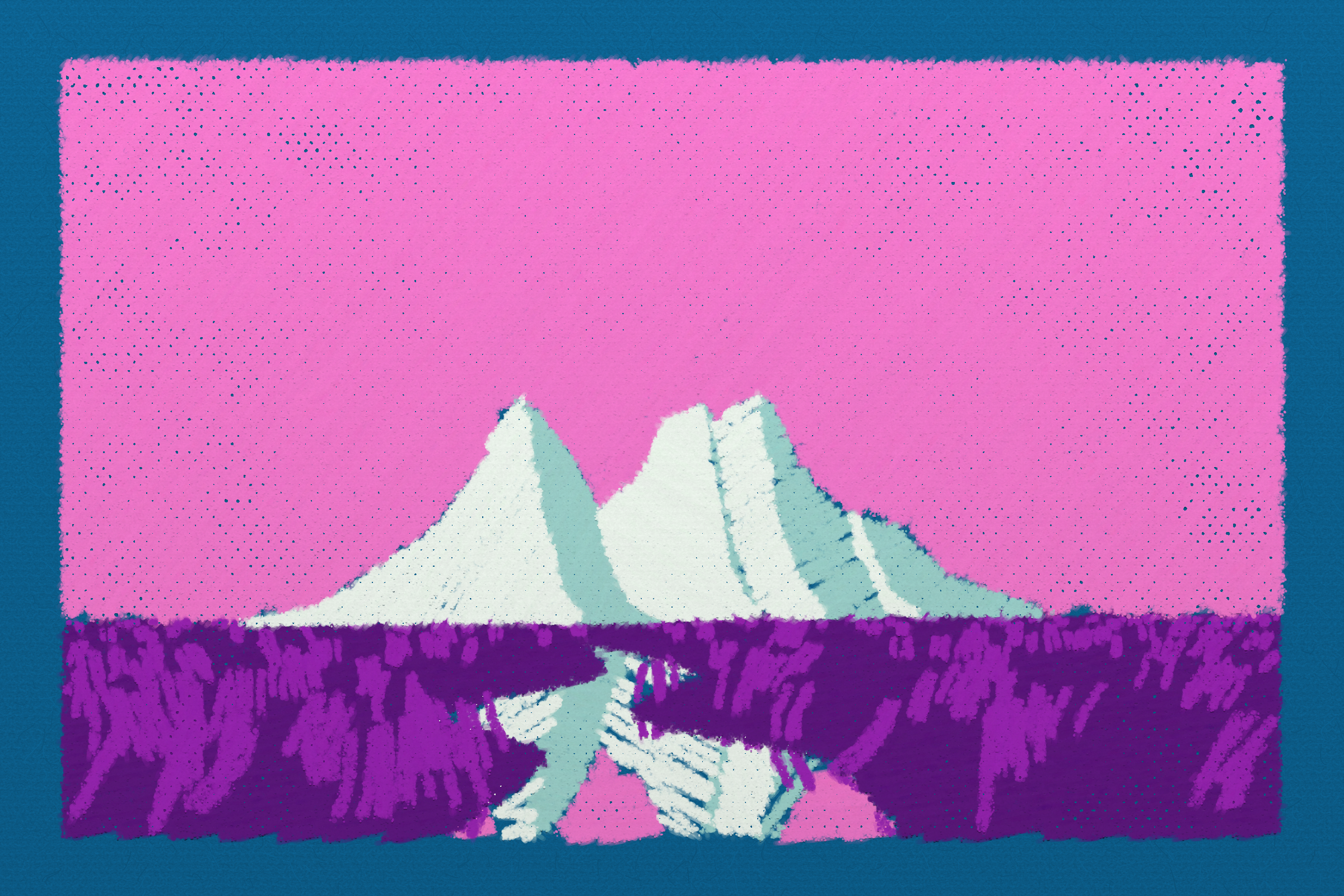 *Arcadia* is a homage to the fridge-worthy landscape art of our youth. Childhood techniques of creating art are re-imagined by the scribbles of a nostalgic, computer-assisted mind.
