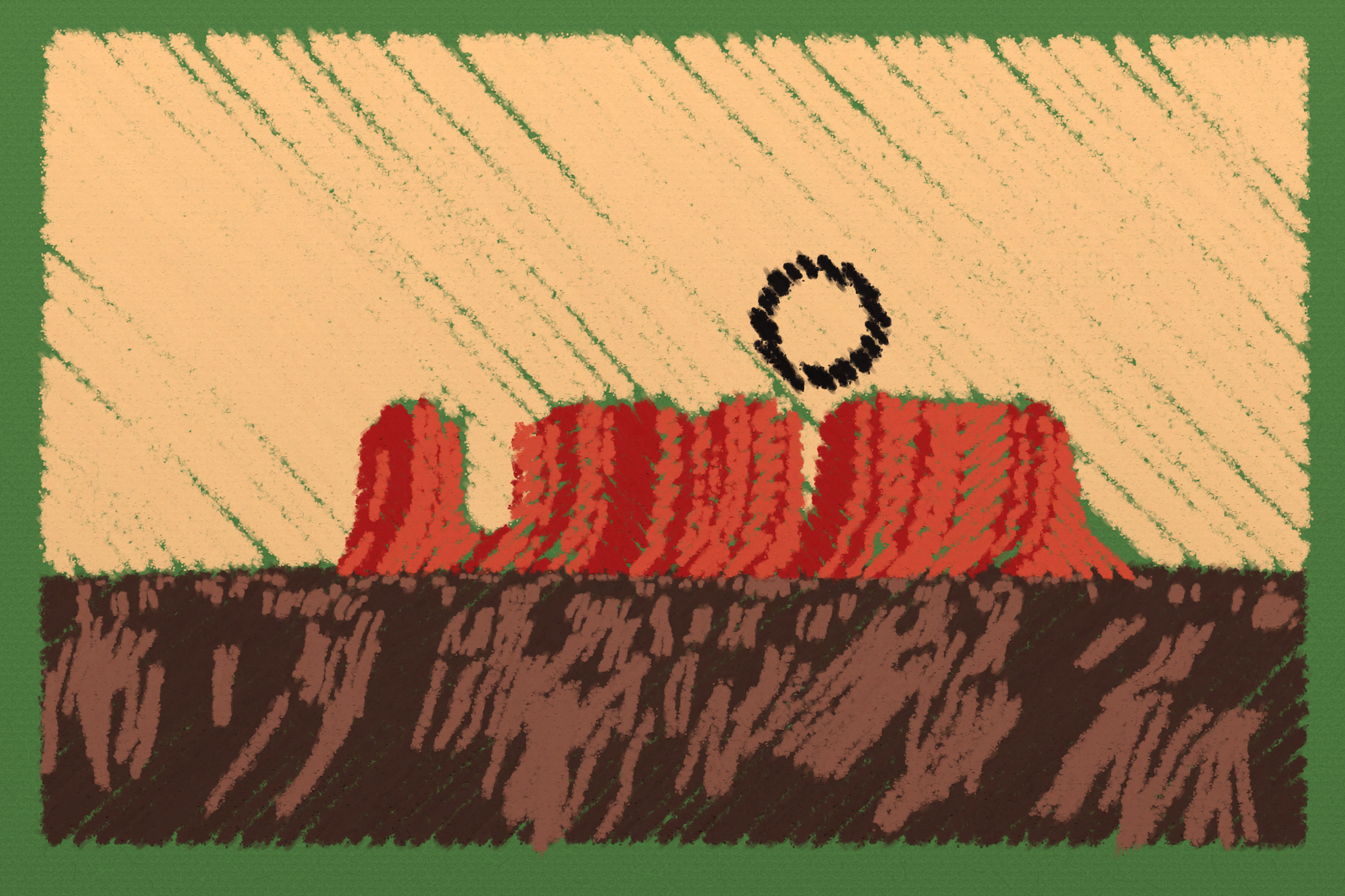 *Arcadia* is a homage to the fridge-worthy landscape art of our youth. Childhood techniques of creating art are re-imagined by the scribbles of a nostalgic, computer-assisted mind.