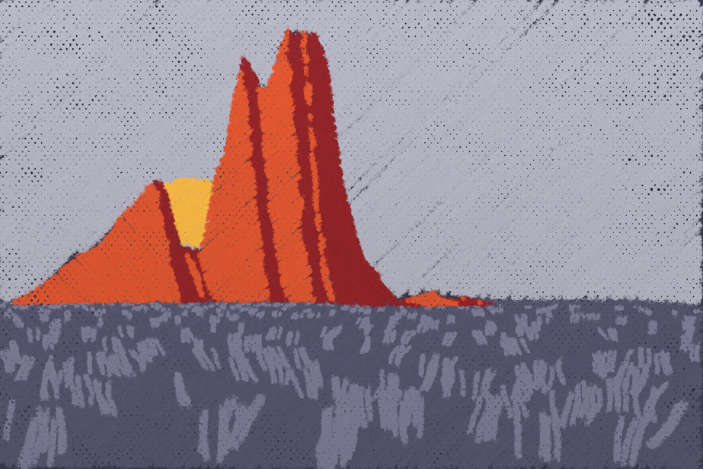 *Arcadia* is a homage to the fridge-worthy landscape art of our youth. Childhood techniques of creating art are re-imagined by the scribbles of a nostalgic, computer-assisted mind.