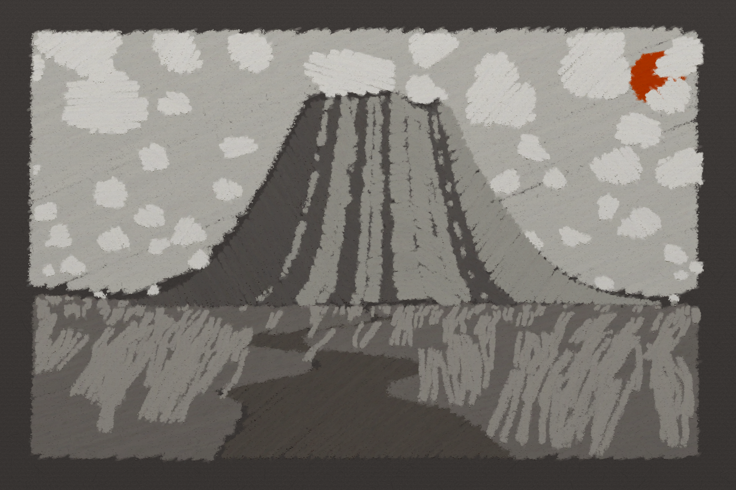*Arcadia* is a homage to the fridge-worthy landscape art of our youth. Childhood techniques of creating art are re-imagined by the scribbles of a nostalgic, computer-assisted mind.