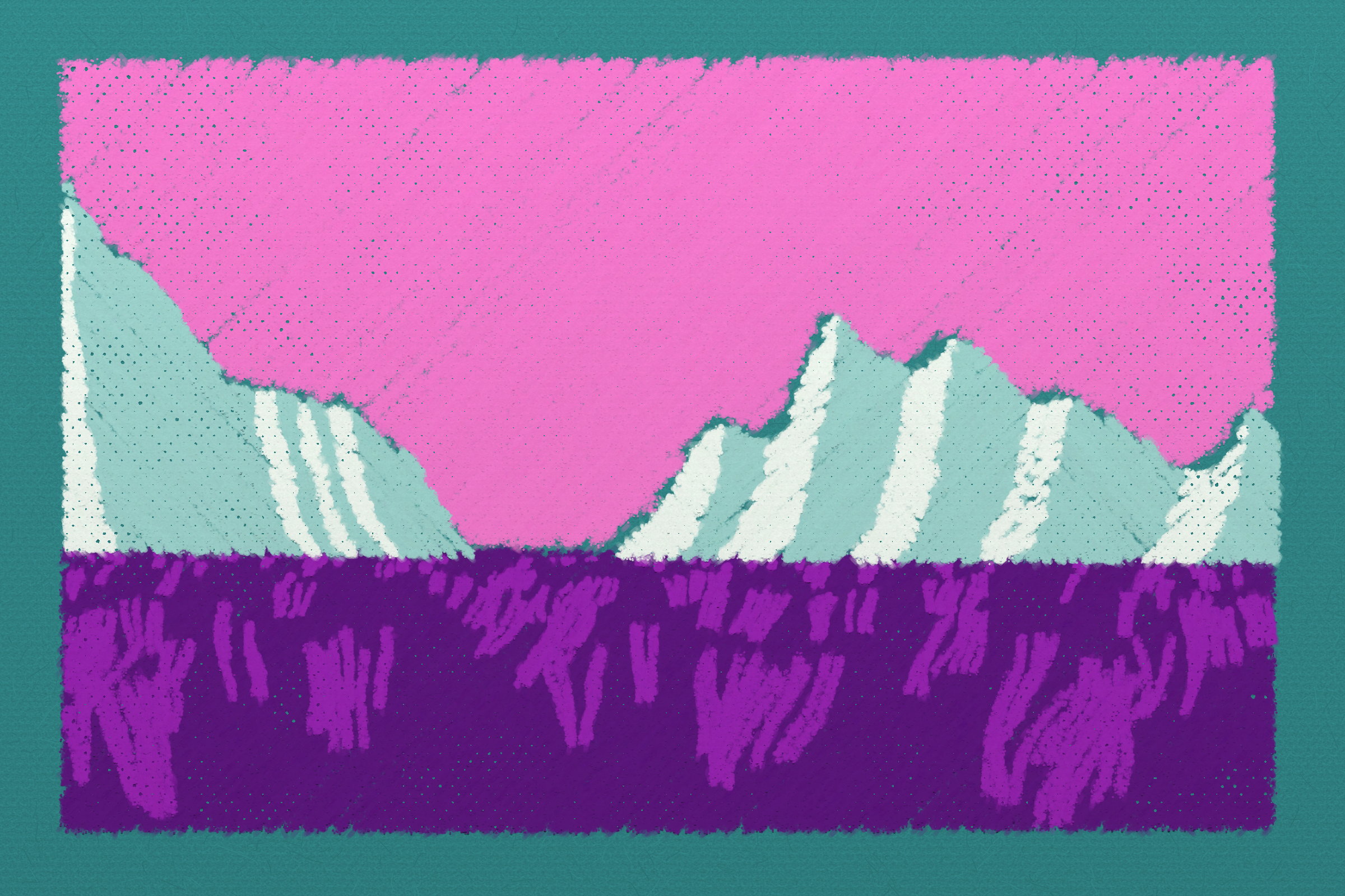 *Arcadia* is a homage to the fridge-worthy landscape art of our youth. Childhood techniques of creating art are re-imagined by the scribbles of a nostalgic, computer-assisted mind.