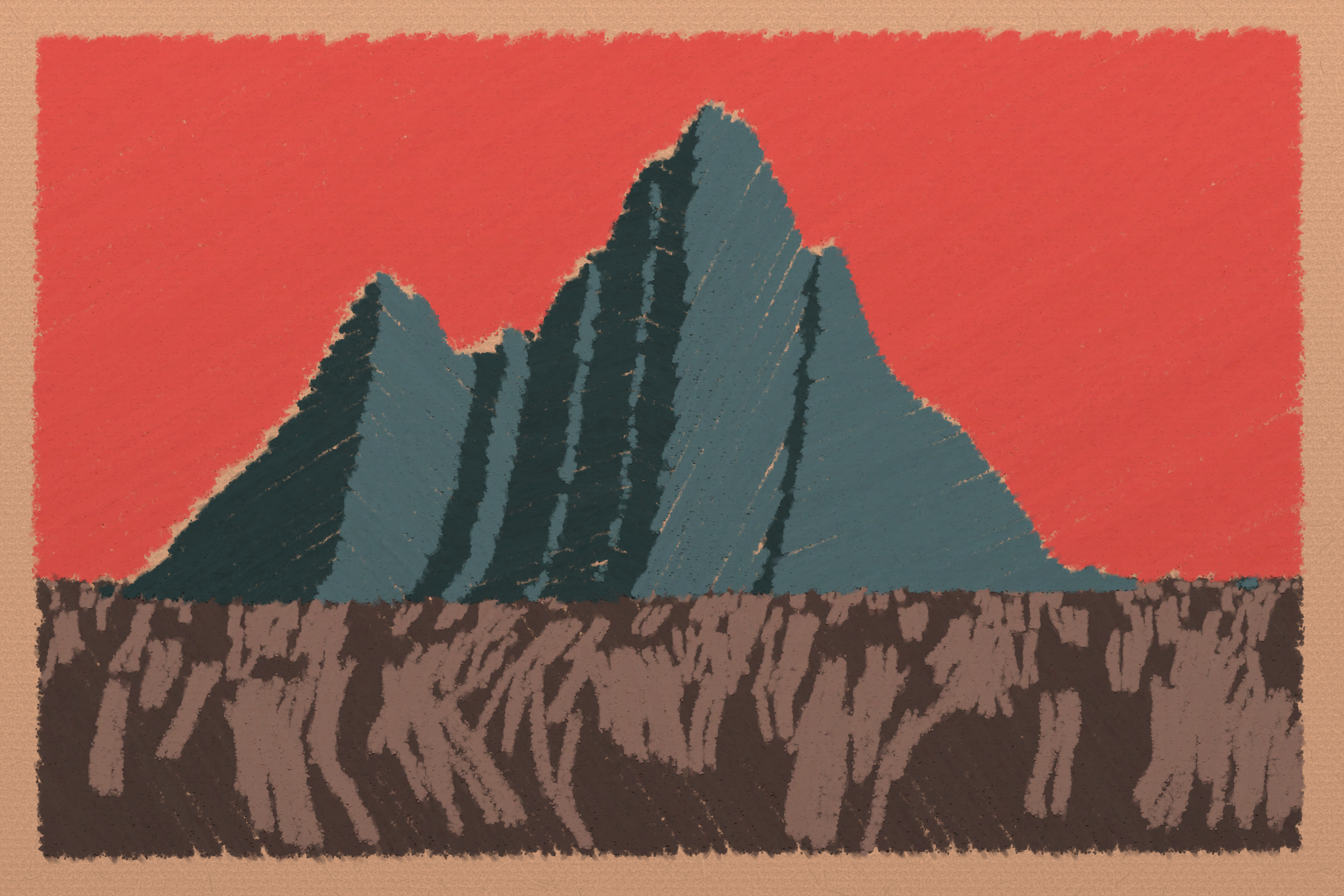 *Arcadia* is a homage to the fridge-worthy landscape art of our youth. Childhood techniques of creating art are re-imagined by the scribbles of a nostalgic, computer-assisted mind.