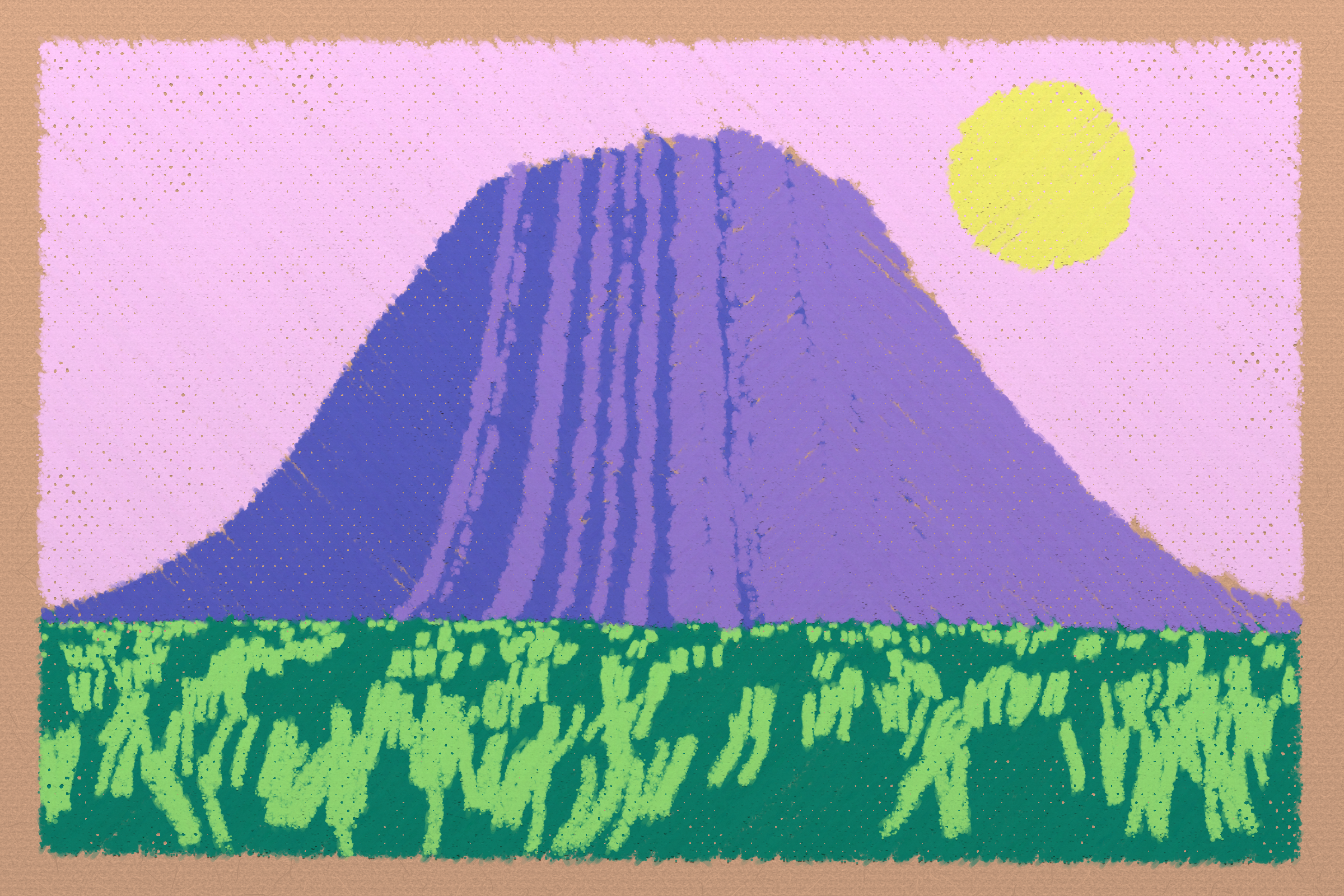*Arcadia* is a homage to the fridge-worthy landscape art of our youth. Childhood techniques of creating art are re-imagined by the scribbles of a nostalgic, computer-assisted mind.