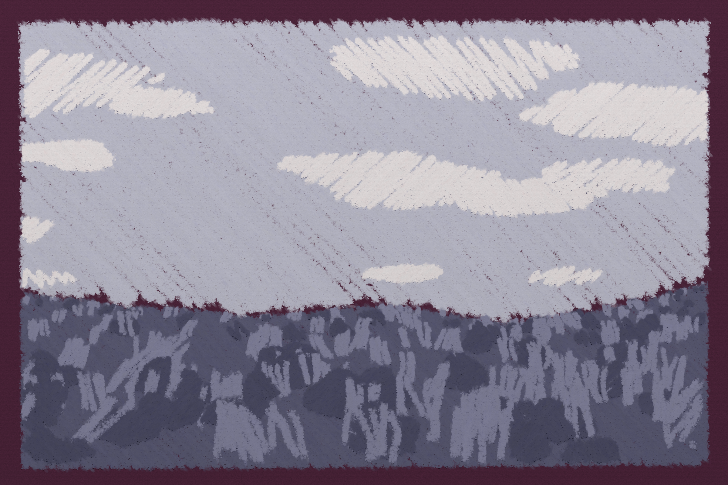 *Arcadia* is a homage to the fridge-worthy landscape art of our youth. Childhood techniques of creating art are re-imagined by the scribbles of a nostalgic, computer-assisted mind.