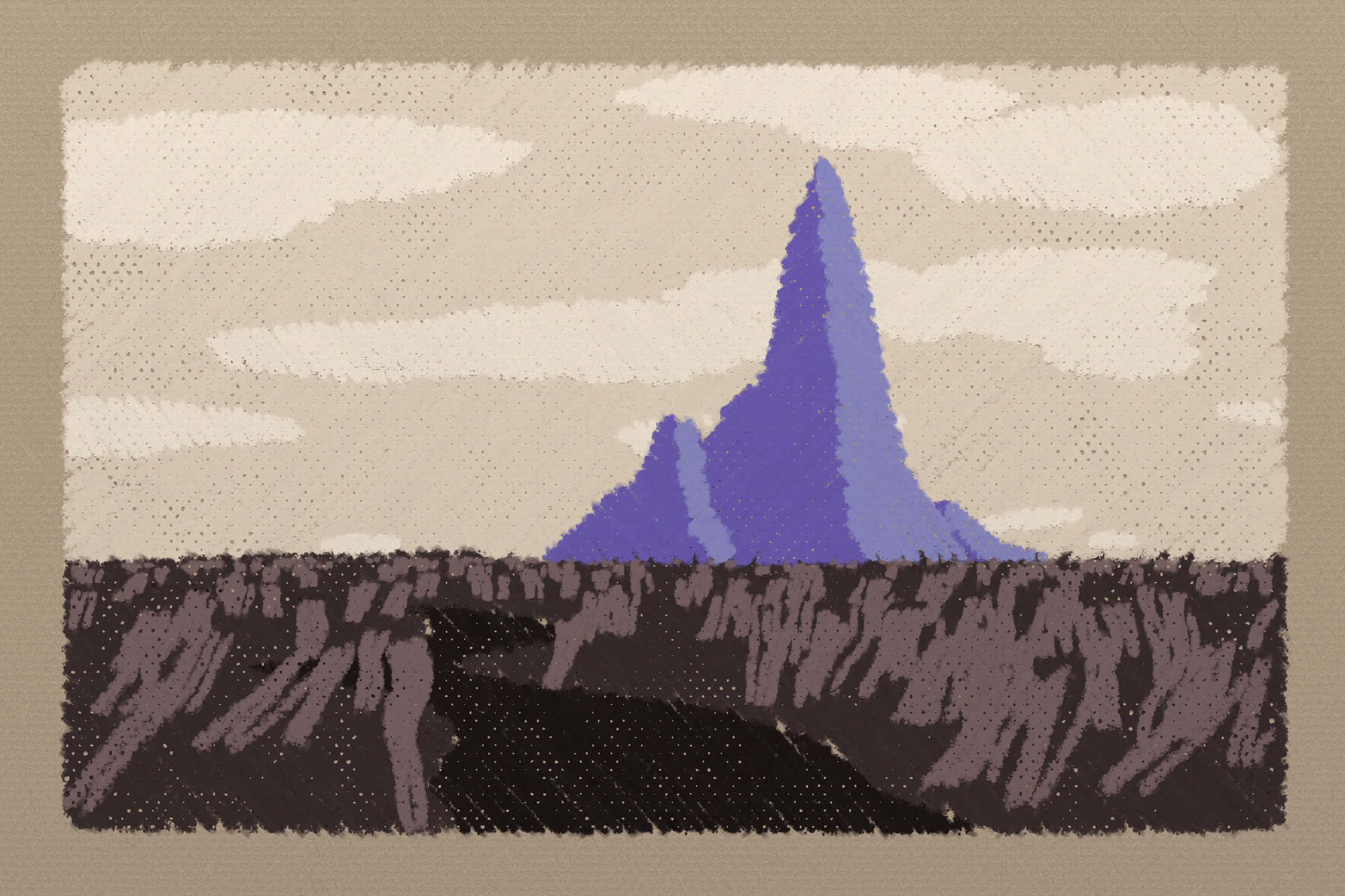 *Arcadia* is a homage to the fridge-worthy landscape art of our youth. Childhood techniques of creating art are re-imagined by the scribbles of a nostalgic, computer-assisted mind.