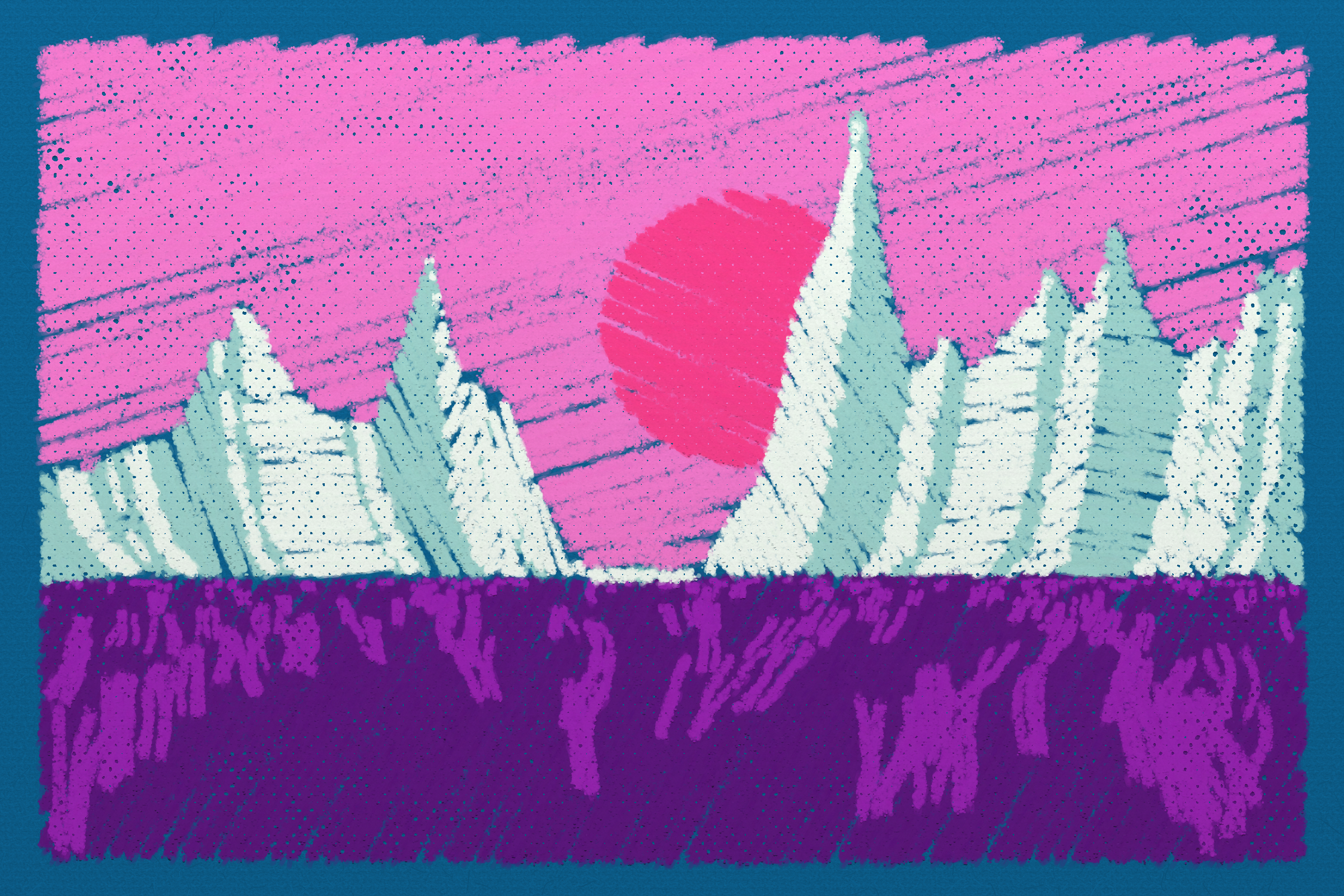 *Arcadia* is a homage to the fridge-worthy landscape art of our youth. Childhood techniques of creating art are re-imagined by the scribbles of a nostalgic, computer-assisted mind.