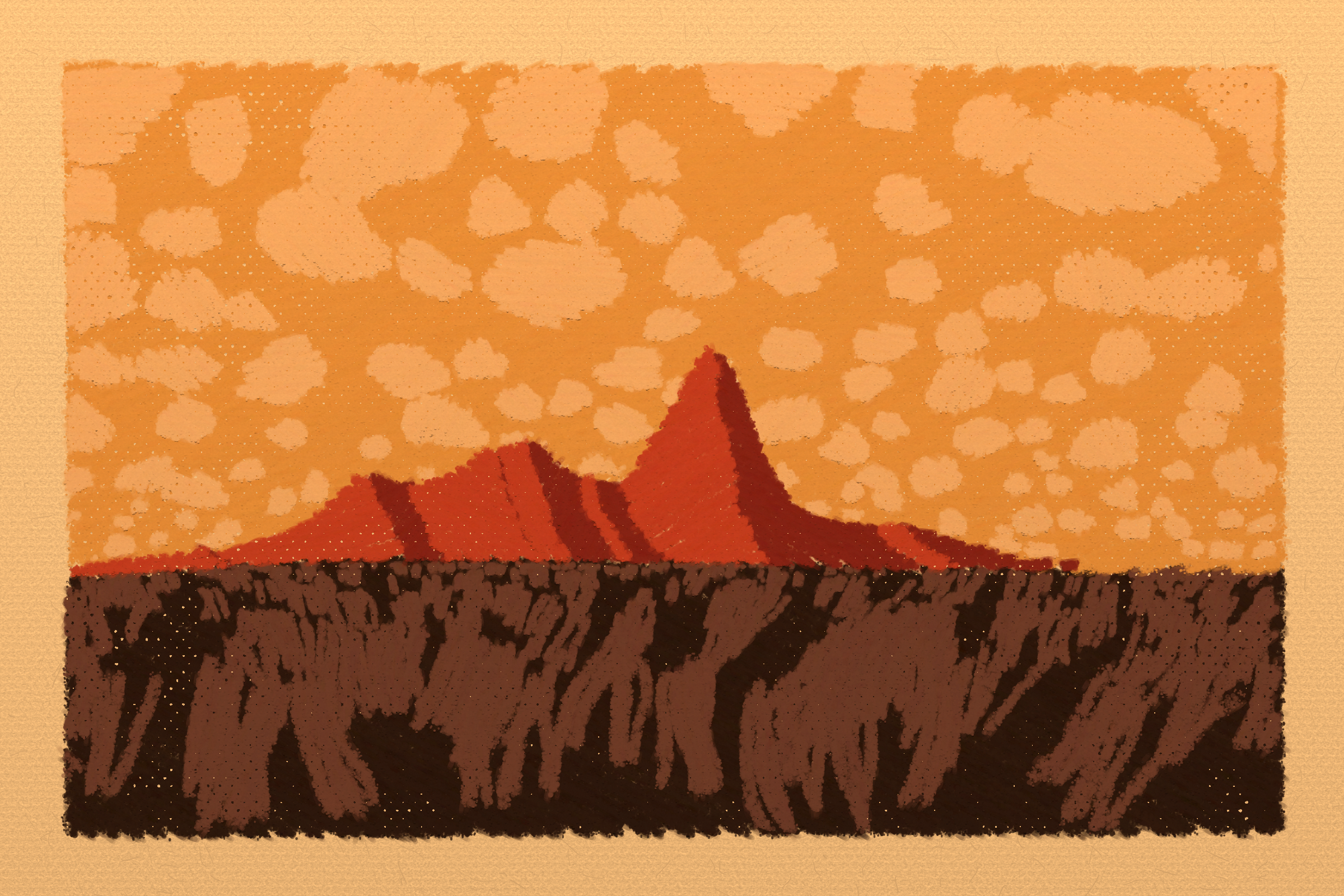 *Arcadia* is a homage to the fridge-worthy landscape art of our youth. Childhood techniques of creating art are re-imagined by the scribbles of a nostalgic, computer-assisted mind.