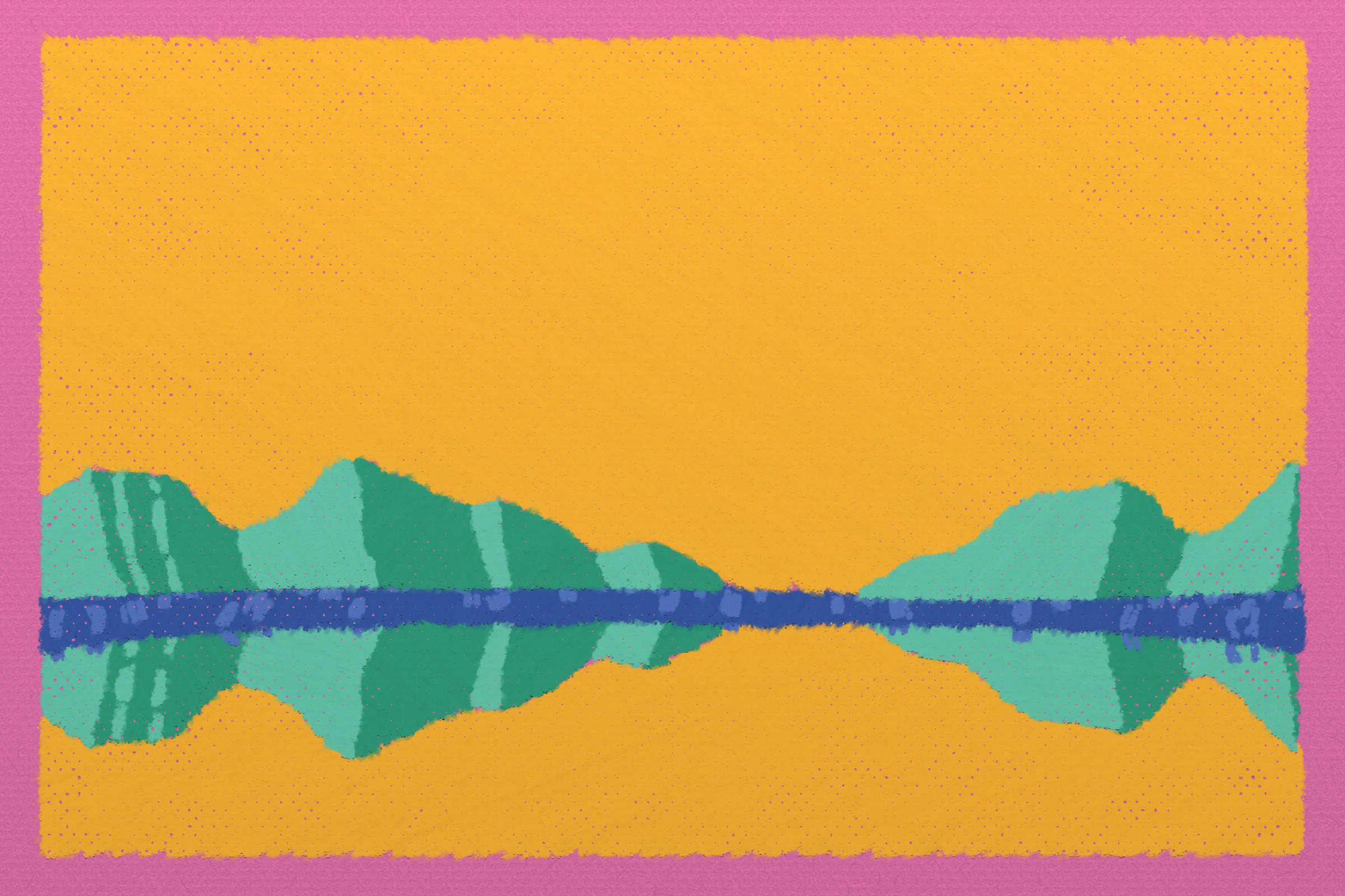 *Arcadia* is a homage to the fridge-worthy landscape art of our youth. Childhood techniques of creating art are re-imagined by the scribbles of a nostalgic, computer-assisted mind.