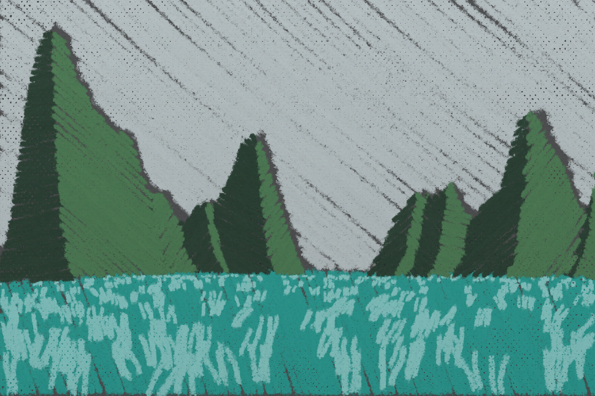 *Arcadia* is a homage to the fridge-worthy landscape art of our youth. Childhood techniques of creating art are re-imagined by the scribbles of a nostalgic, computer-assisted mind.
