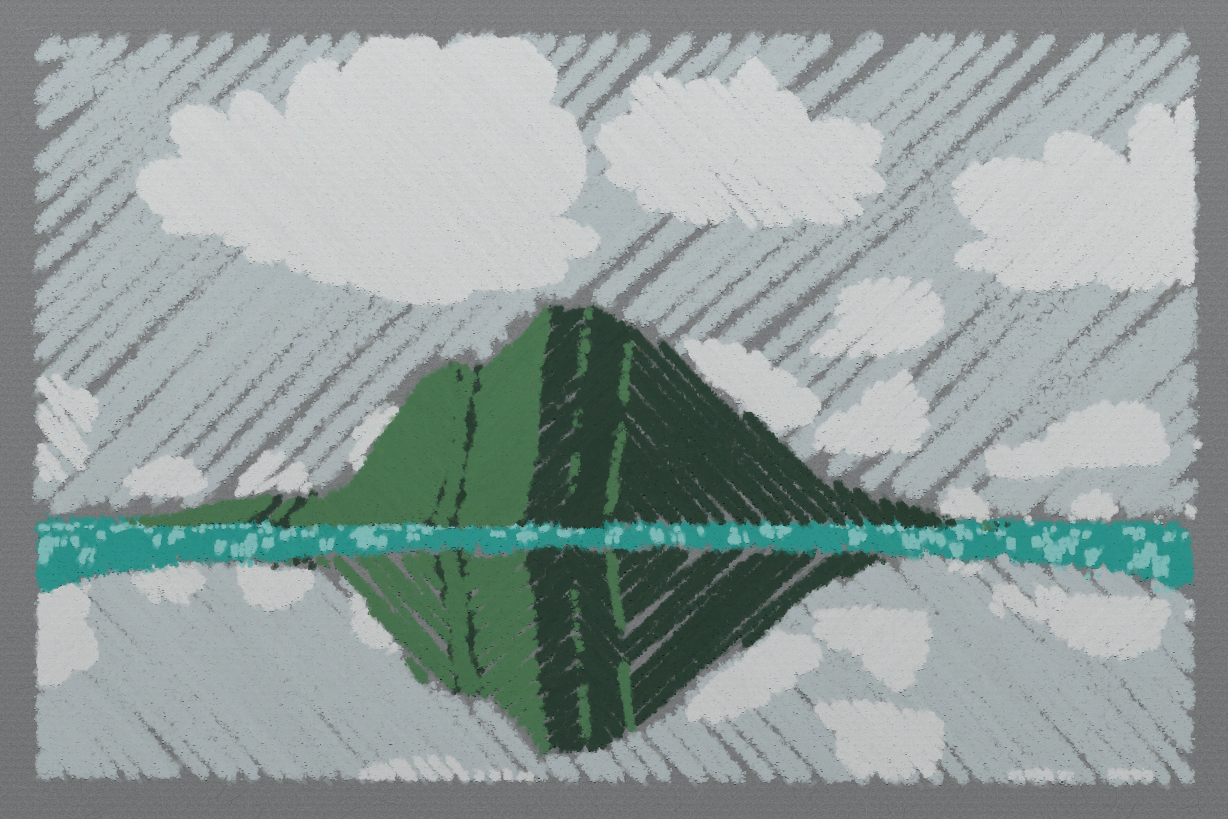 *Arcadia* is a homage to the fridge-worthy landscape art of our youth. Childhood techniques of creating art are re-imagined by the scribbles of a nostalgic, computer-assisted mind.