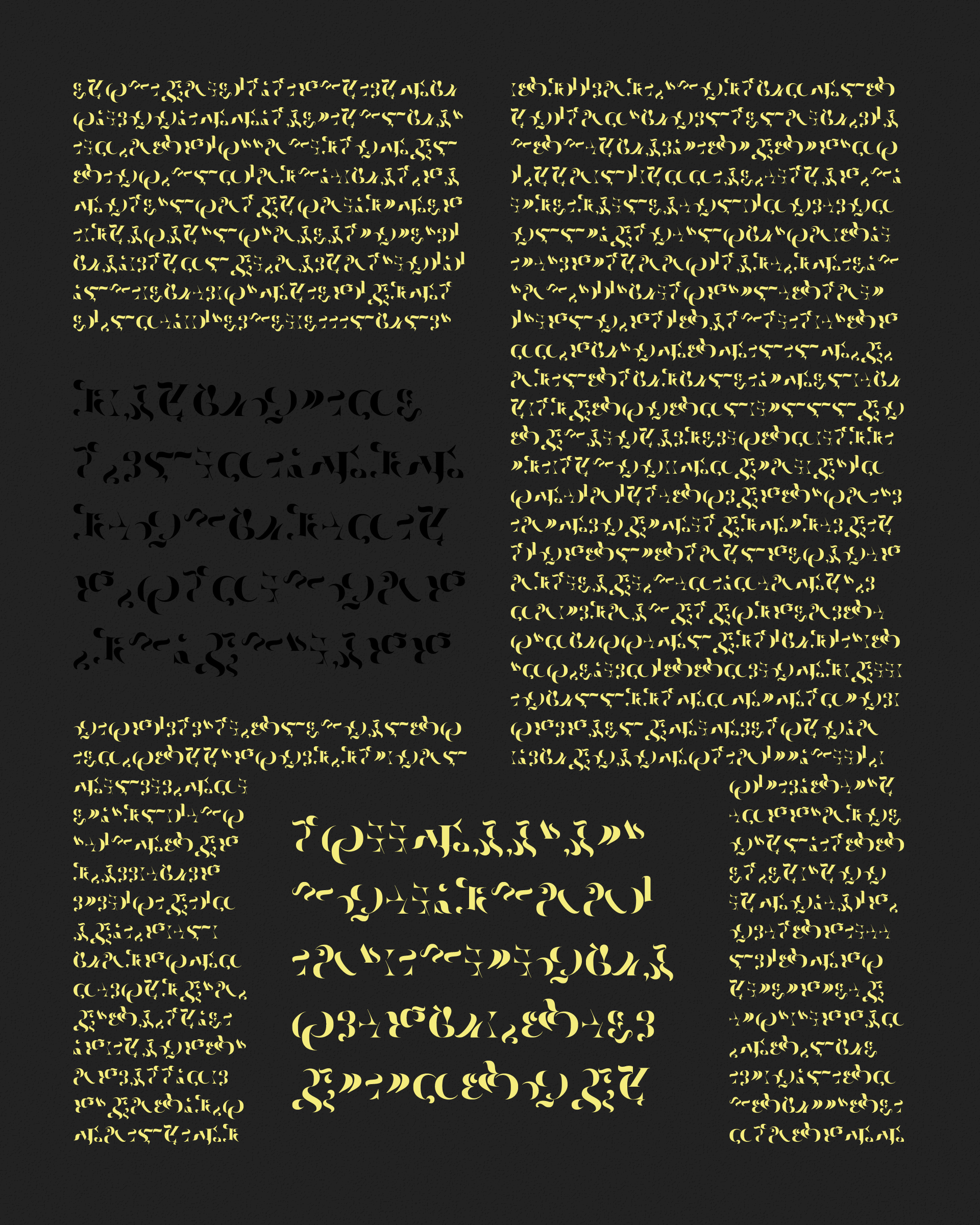 Abstract typographic elements slide together to create new characters. In some compositions, a single character is featured. In others, characters string together to form words and sentences, which the algorithm shapes into often-familiar layouts. // The type designer Gerard Unger said “it is almost impossible to look and read at the same time”. Asemica invites you to look without the burden of legibility. // Created by Emily Edelman, Dima Ofman, and Andrew Badr. Command-S to download a vector file. // Dutch Auction Tiers: 10 / 7 / 5 / 4 / 3.4 / 2.8 / 2.4 / 2 / 1.75 / 1.5 / 1.25 / 1 / 0.75 / 0.5 / 0.25 / 0.1