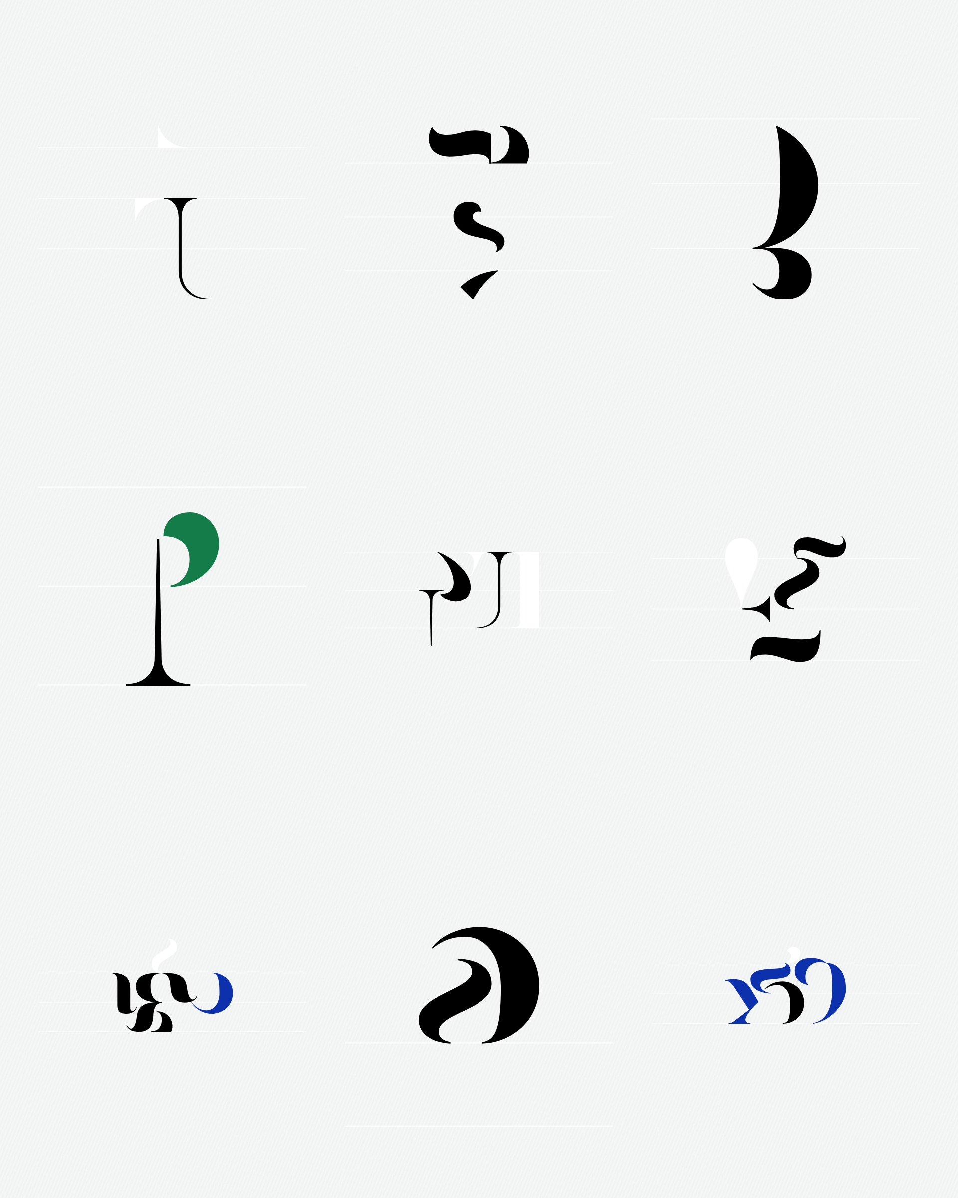 Abstract typographic elements slide together to create new characters. In some compositions, a single character is featured. In others, characters string together to form words and sentences, which the algorithm shapes into often-familiar layouts. // The type designer Gerard Unger said “it is almost impossible to look and read at the same time”. Asemica invites you to look without the burden of legibility. // Created by Emily Edelman, Dima Ofman, and Andrew Badr. Command-S to download a vector file. // Dutch Auction Tiers: 10 / 7 / 5 / 4 / 3.4 / 2.8 / 2.4 / 2 / 1.75 / 1.5 / 1.25 / 1 / 0.75 / 0.5 / 0.25 / 0.1