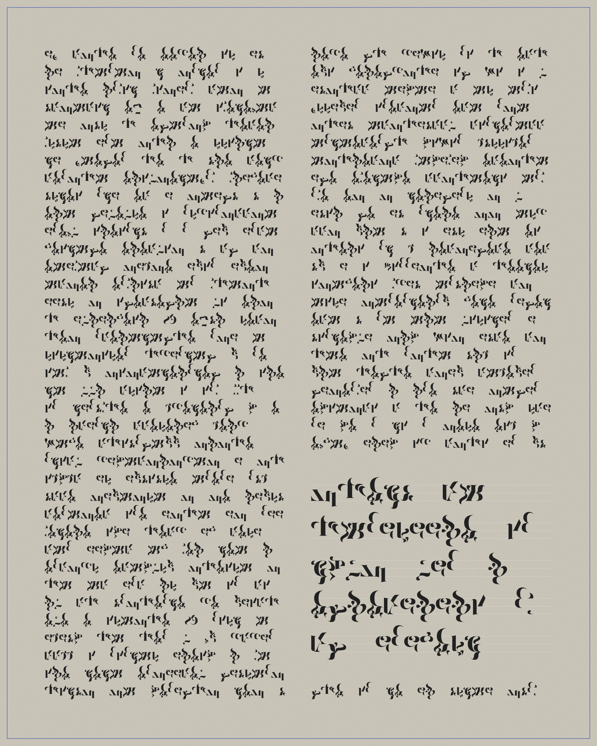 Abstract typographic elements slide together to create new characters. In some compositions, a single character is featured. In others, characters string together to form words and sentences, which the algorithm shapes into often-familiar layouts. // The type designer Gerard Unger said “it is almost impossible to look and read at the same time”. Asemica invites you to look without the burden of legibility. // Created by Emily Edelman, Dima Ofman, and Andrew Badr. Command-S to download a vector file. // Dutch Auction Tiers: 10 / 7 / 5 / 4 / 3.4 / 2.8 / 2.4 / 2 / 1.75 / 1.5 / 1.25 / 1 / 0.75 / 0.5 / 0.25 / 0.1