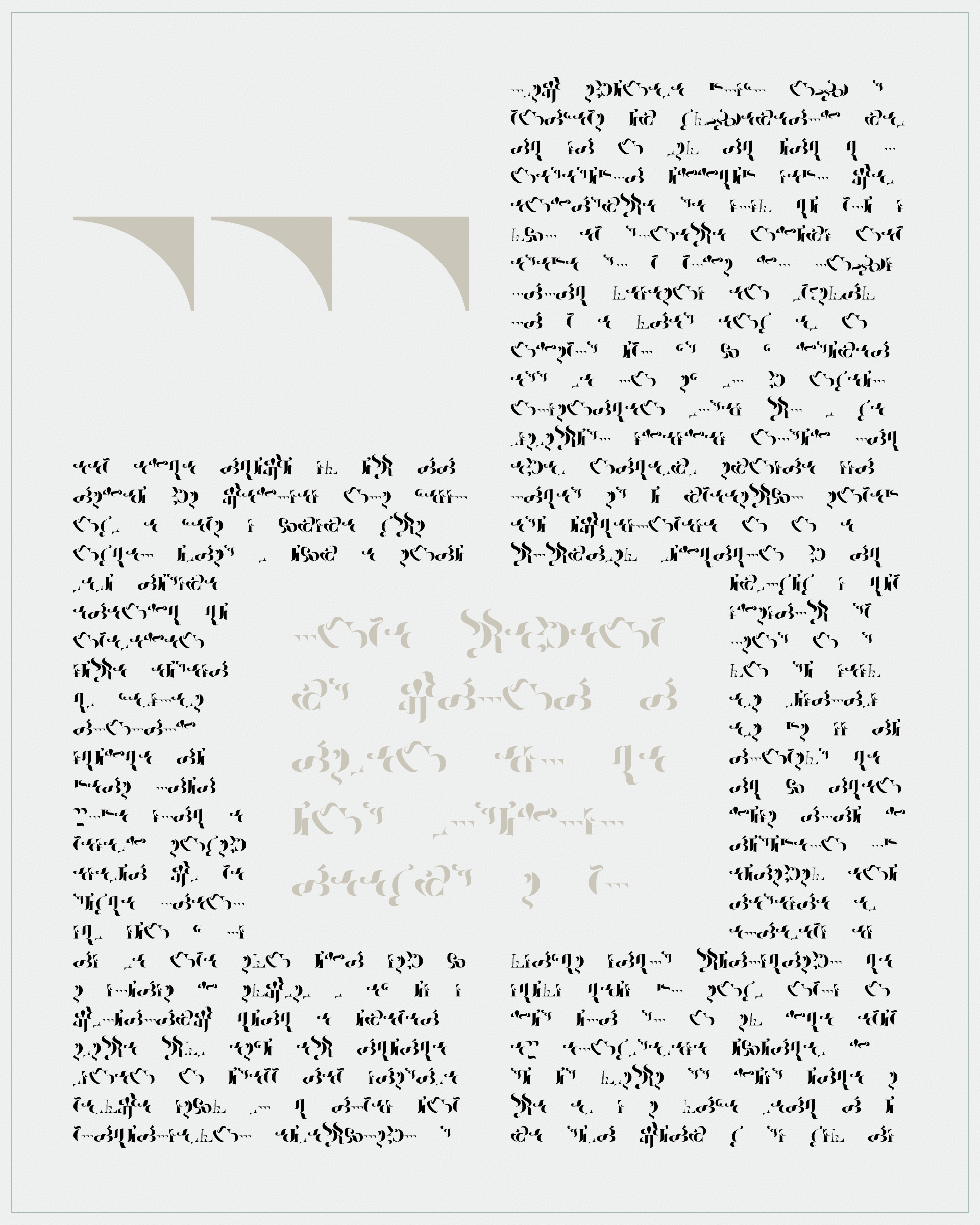 Abstract typographic elements slide together to create new characters. In some compositions, a single character is featured. In others, characters string together to form words and sentences, which the algorithm shapes into often-familiar layouts. // The type designer Gerard Unger said “it is almost impossible to look and read at the same time”. Asemica invites you to look without the burden of legibility. // Created by Emily Edelman, Dima Ofman, and Andrew Badr. Command-S to download a vector file. // Dutch Auction Tiers: 10 / 7 / 5 / 4 / 3.4 / 2.8 / 2.4 / 2 / 1.75 / 1.5 / 1.25 / 1 / 0.75 / 0.5 / 0.25 / 0.1