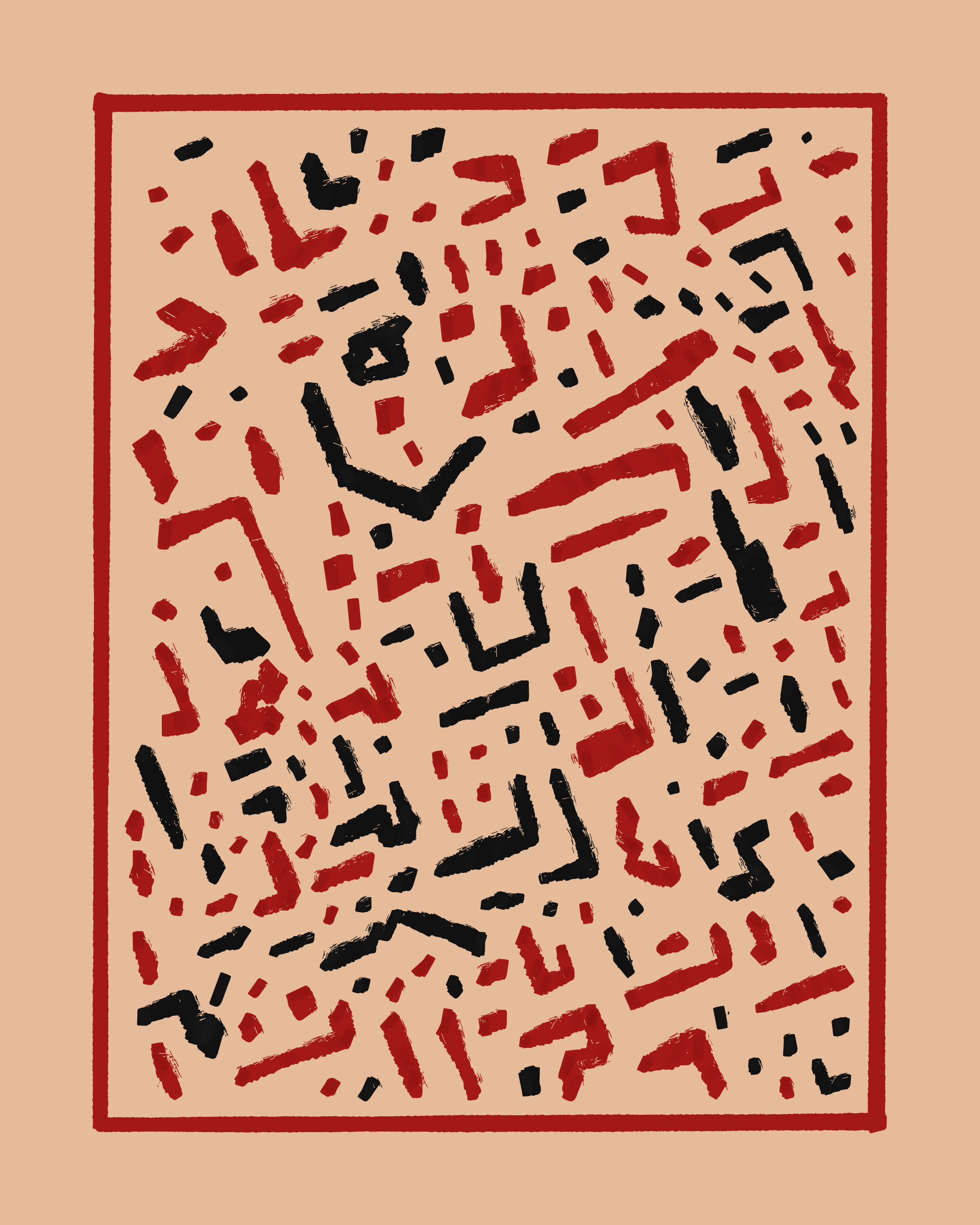 This project explores the age-old computer art phenomenon of inviting the viewer to actively participate in the interpretation of the visual output. The way "Sharp-E" draws the strokes is through a mix of various movements ā irregular curves, straight lines, sudden changes in direction ā in a classic random walk algorithm, while avoiding overlaps with previously drawn strokes. There are no pre-programmed forms per se, but nevertheless it can be common for the viewer to perceive images, symbols, meaning in the generated output.