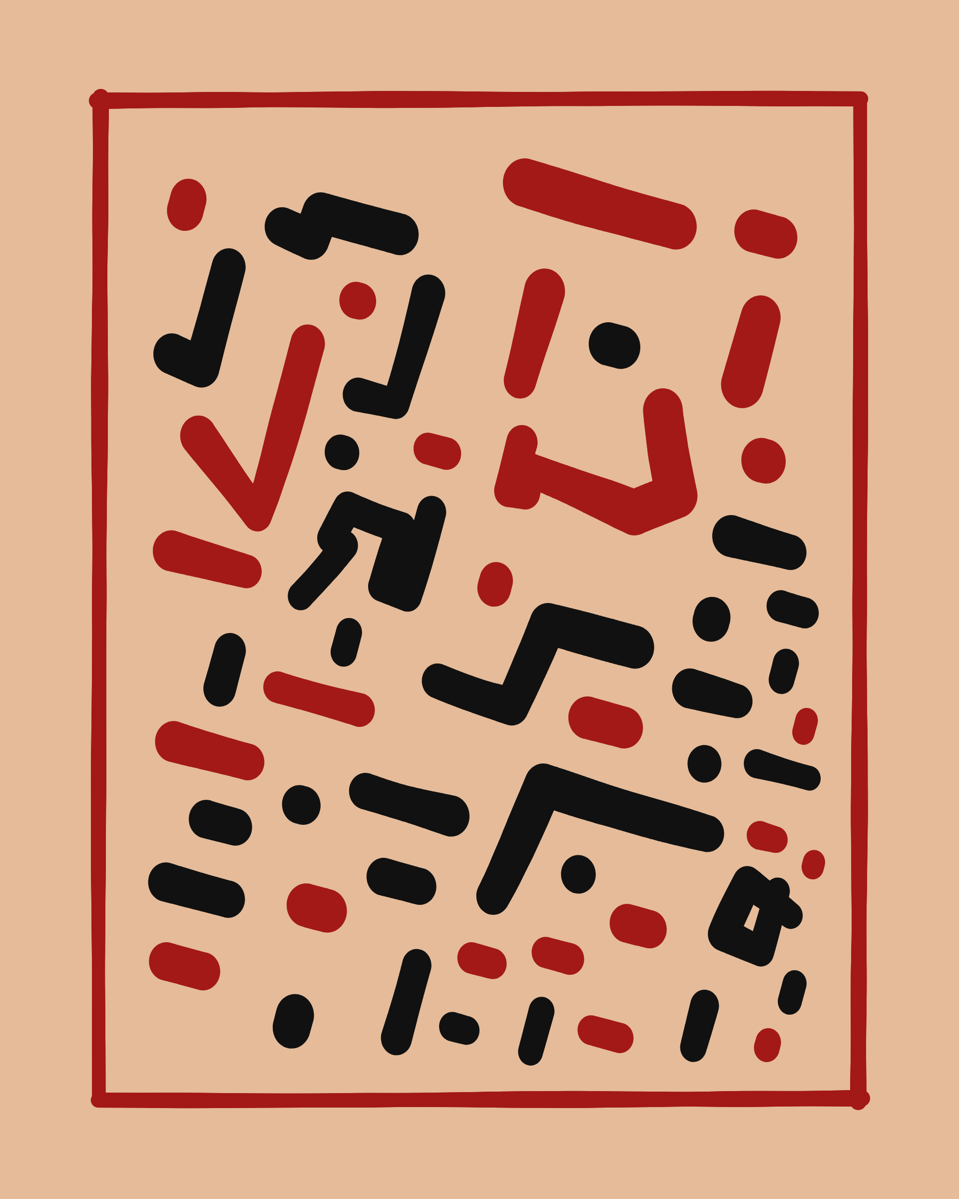 This project explores the age-old computer art phenomenon of inviting the viewer to actively participate in the interpretation of the visual output. The way "Sharp-E" draws the strokes is through a mix of various movements β irregular curves, straight lines, sudden changes in direction β in a classic random walk algorithm, while avoiding overlaps with previously drawn strokes. There are no pre-programmed forms per se, but nevertheless it can be common for the viewer to perceive images, symbols, meaning in the generated output.