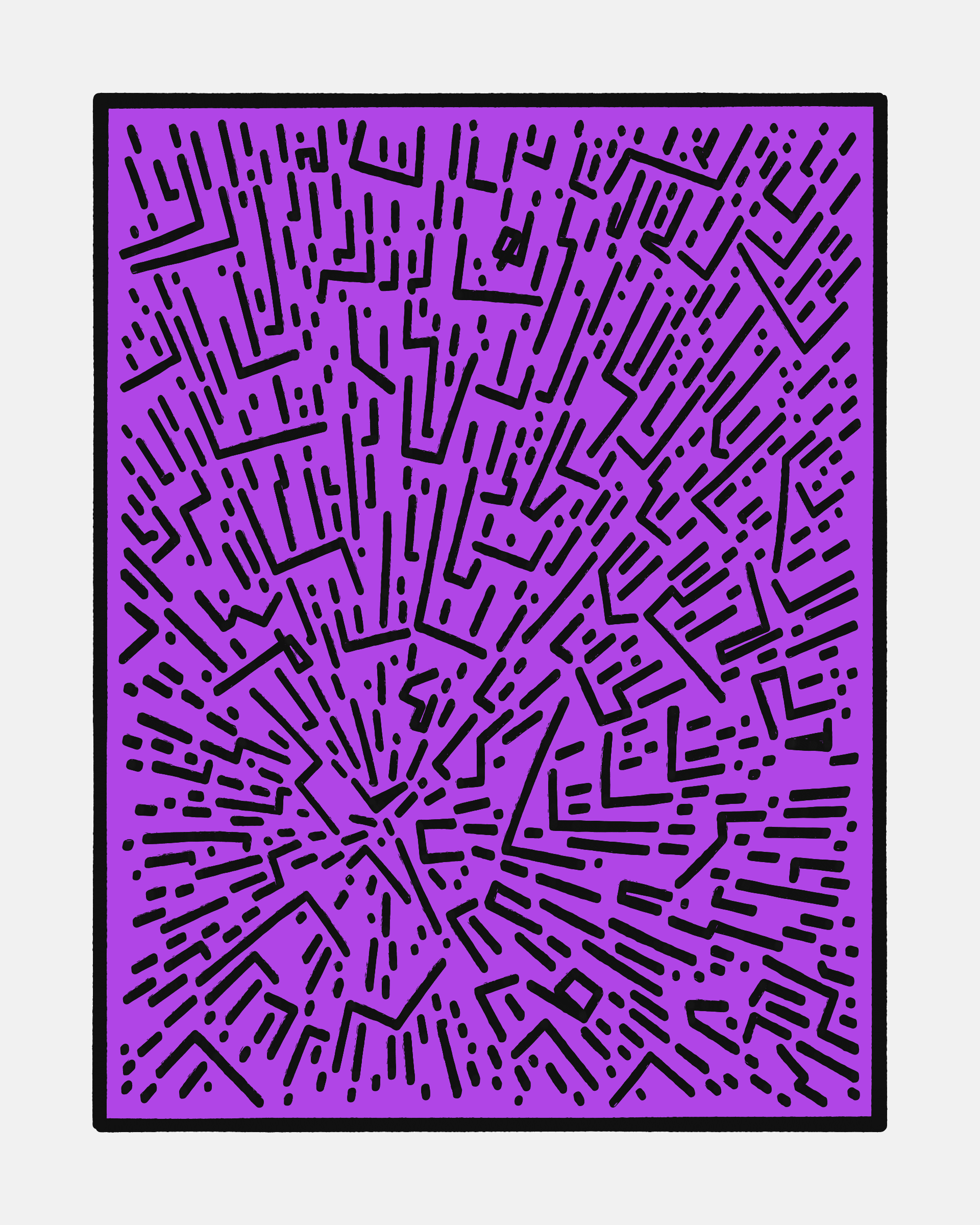 This project explores the age-old computer art phenomenon of inviting the viewer to actively participate in the interpretation of the visual output. The way "Sharp-E" draws the strokes is through a mix of various movements ā irregular curves, straight lines, sudden changes in direction ā in a classic random walk algorithm, while avoiding overlaps with previously drawn strokes. There are no pre-programmed forms per se, but nevertheless it can be common for the viewer to perceive images, symbols, meaning in the generated output.