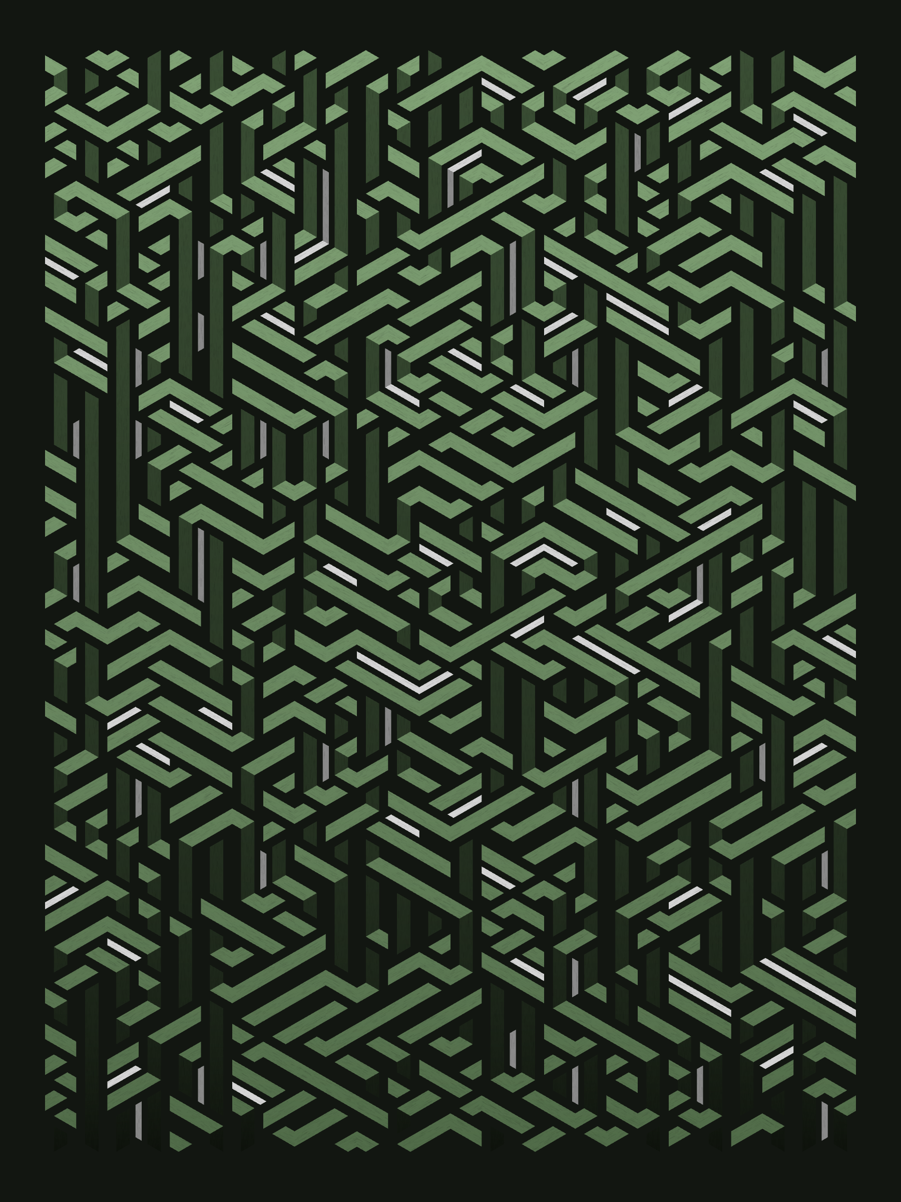 Lines are bent and shaded. There are no wrong turns. [Interaction in live view: press 1-7 or left/right arrow keys to see the stages of sketch construction: 1-grid, 2-divide, 3-tile, 4-bend, 5-shade, 6-color, 7-texture]