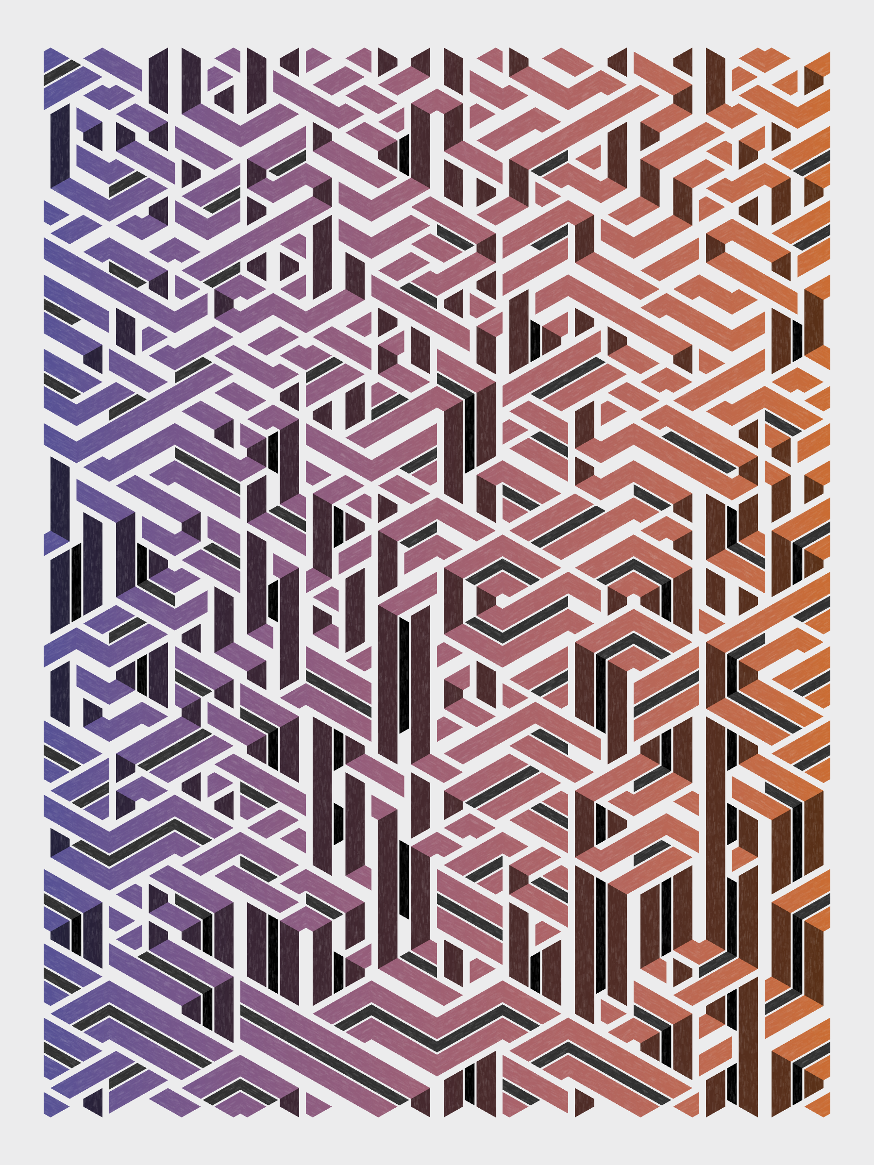 Lines are bent and shaded. There are no wrong turns. [Interaction in live view: press 1-7 or left/right arrow keys to see the stages of sketch construction: 1-grid, 2-divide, 3-tile, 4-bend, 5-shade, 6-color, 7-texture]