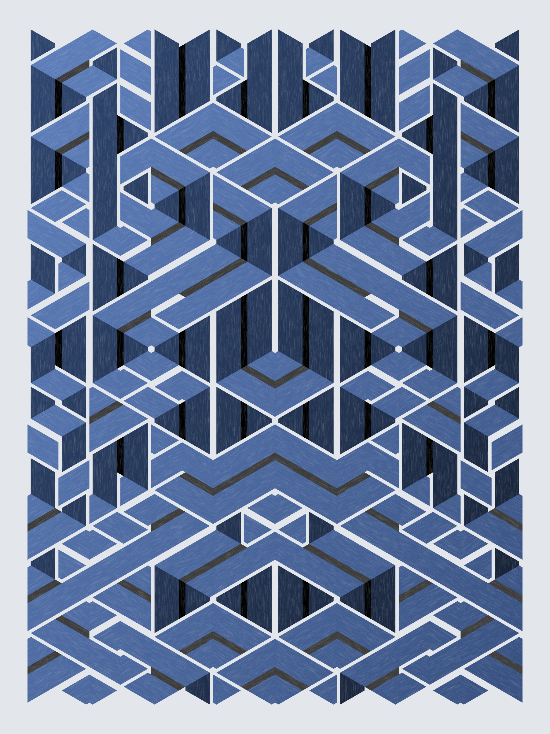Lines are bent and shaded. There are no wrong turns. [Interaction in live view: press 1-7 or left/right arrow keys to see the stages of sketch construction: 1-grid, 2-divide, 3-tile, 4-bend, 5-shade, 6-color, 7-texture]