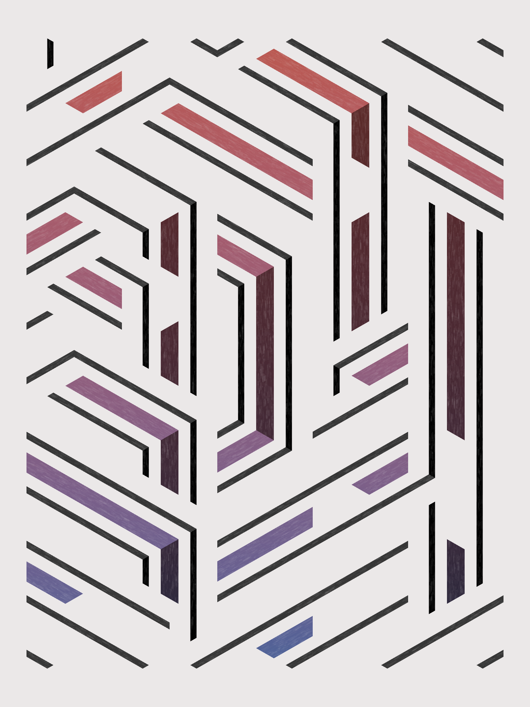 Lines are bent and shaded. There are no wrong turns. [Interaction in live view: press 1-7 or left/right arrow keys to see the stages of sketch construction: 1-grid, 2-divide, 3-tile, 4-bend, 5-shade, 6-color, 7-texture]
