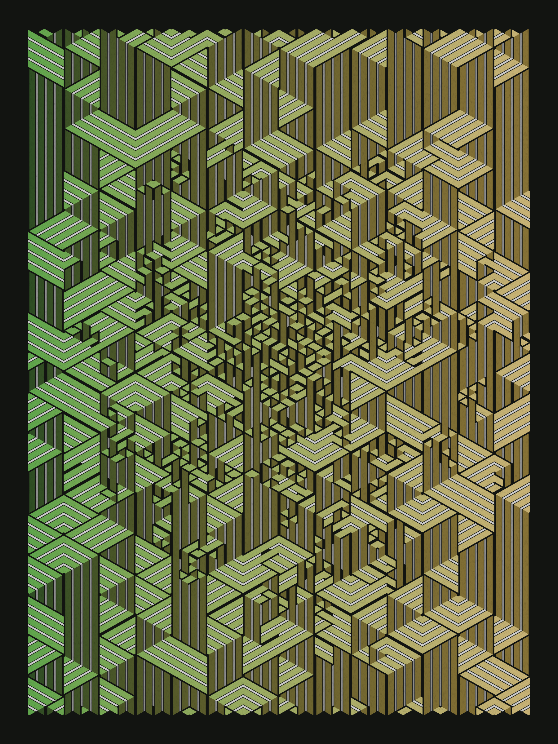 Lines are bent and shaded. There are no wrong turns. [Interaction in live view: press 1-7 or left/right arrow keys to see the stages of sketch construction: 1-grid, 2-divide, 3-tile, 4-bend, 5-shade, 6-color, 7-texture]