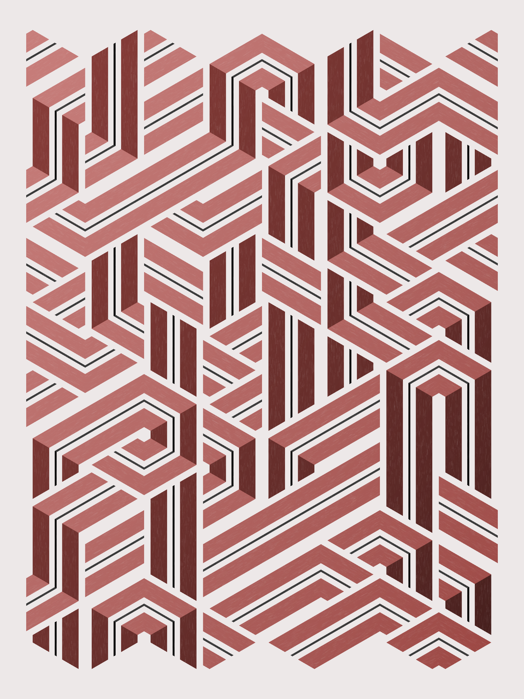 Lines are bent and shaded. There are no wrong turns. [Interaction in live view: press 1-7 or left/right arrow keys to see the stages of sketch construction: 1-grid, 2-divide, 3-tile, 4-bend, 5-shade, 6-color, 7-texture]