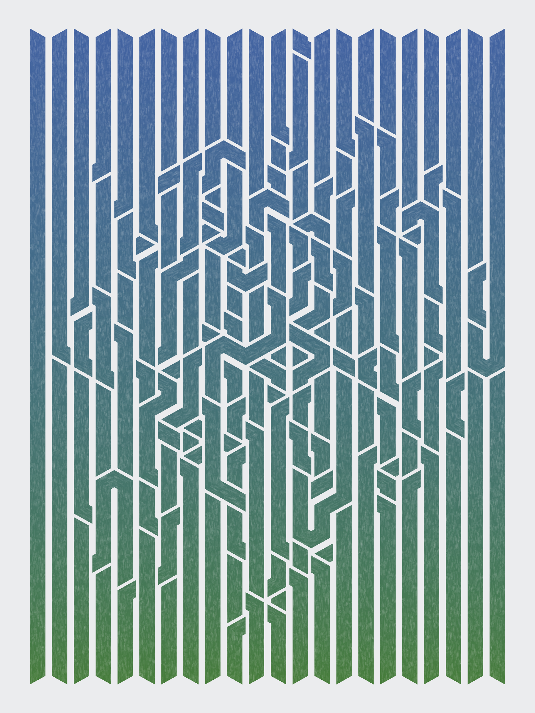 Lines are bent and shaded. There are no wrong turns. [Interaction in live view: press 1-7 or left/right arrow keys to see the stages of sketch construction: 1-grid, 2-divide, 3-tile, 4-bend, 5-shade, 6-color, 7-texture]