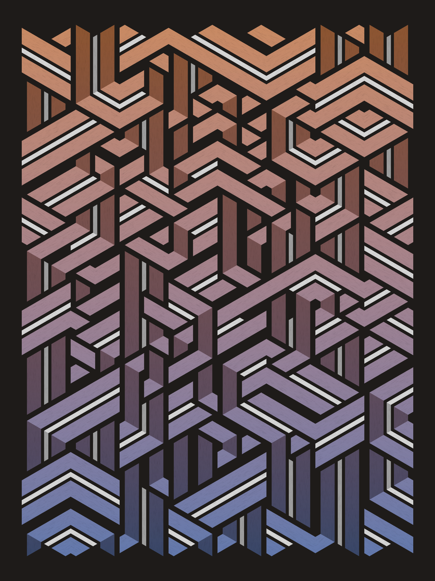 Lines are bent and shaded. There are no wrong turns. [Interaction in live view: press 1-7 or left/right arrow keys to see the stages of sketch construction: 1-grid, 2-divide, 3-tile, 4-bend, 5-shade, 6-color, 7-texture]
