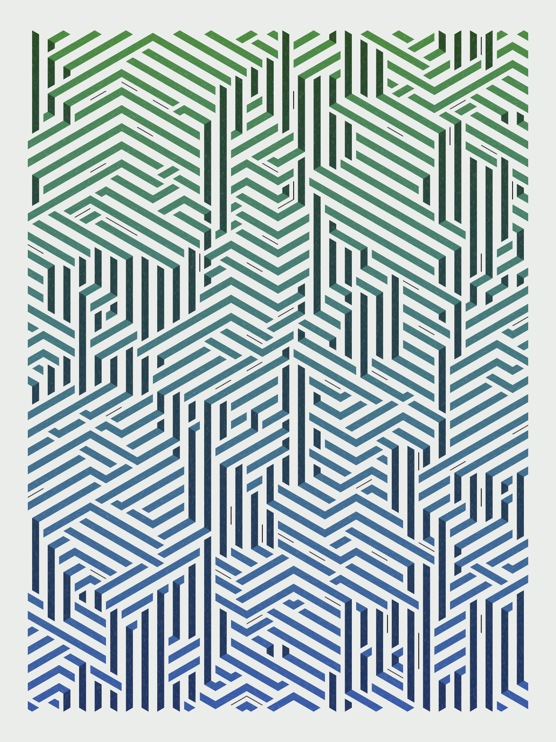 Lines are bent and shaded. There are no wrong turns. [Interaction in live view: press 1-7 or left/right arrow keys to see the stages of sketch construction: 1-grid, 2-divide, 3-tile, 4-bend, 5-shade, 6-color, 7-texture]