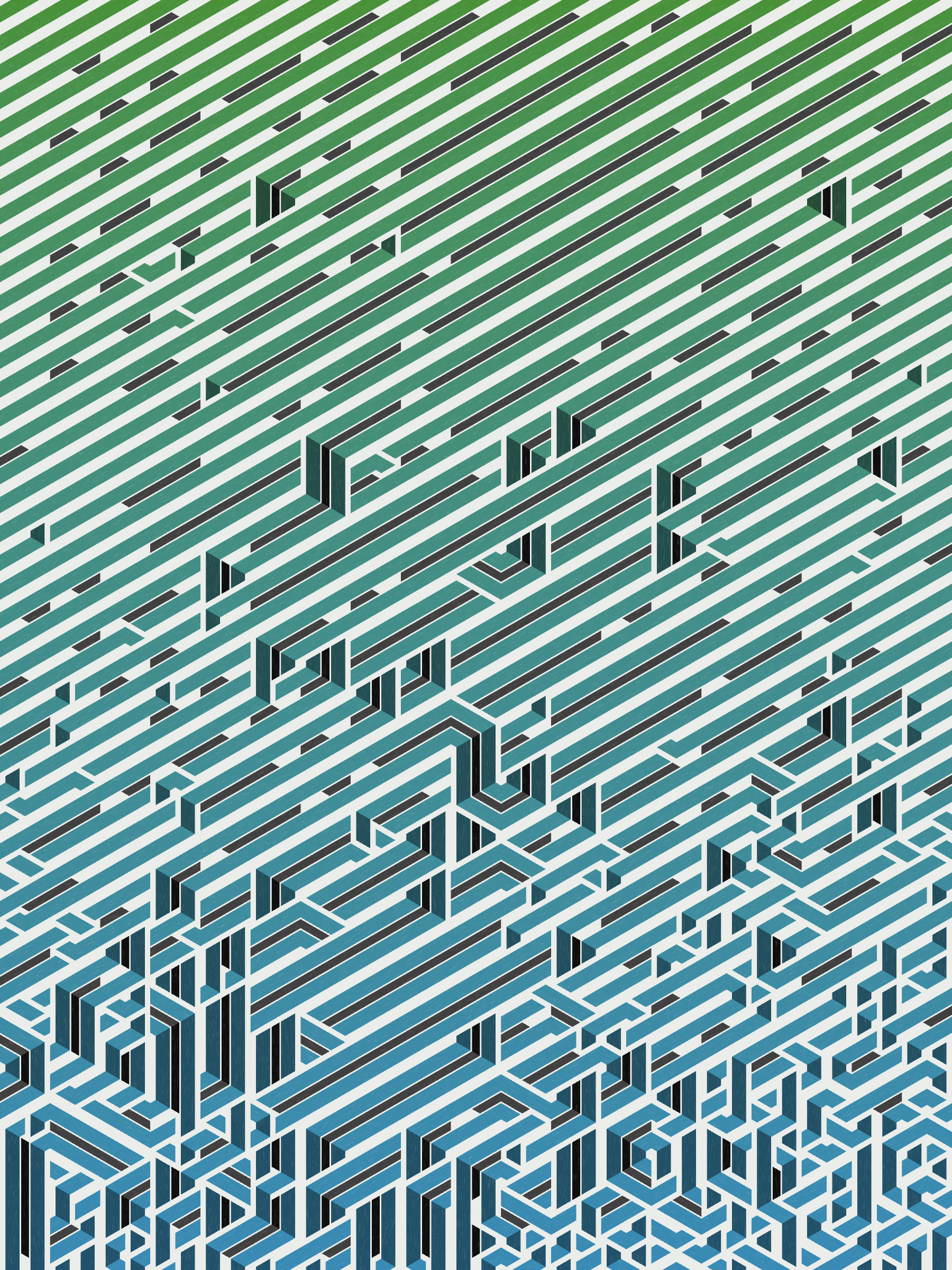 Lines are bent and shaded. There are no wrong turns. [Interaction in live view: press 1-7 or left/right arrow keys to see the stages of sketch construction: 1-grid, 2-divide, 3-tile, 4-bend, 5-shade, 6-color, 7-texture]