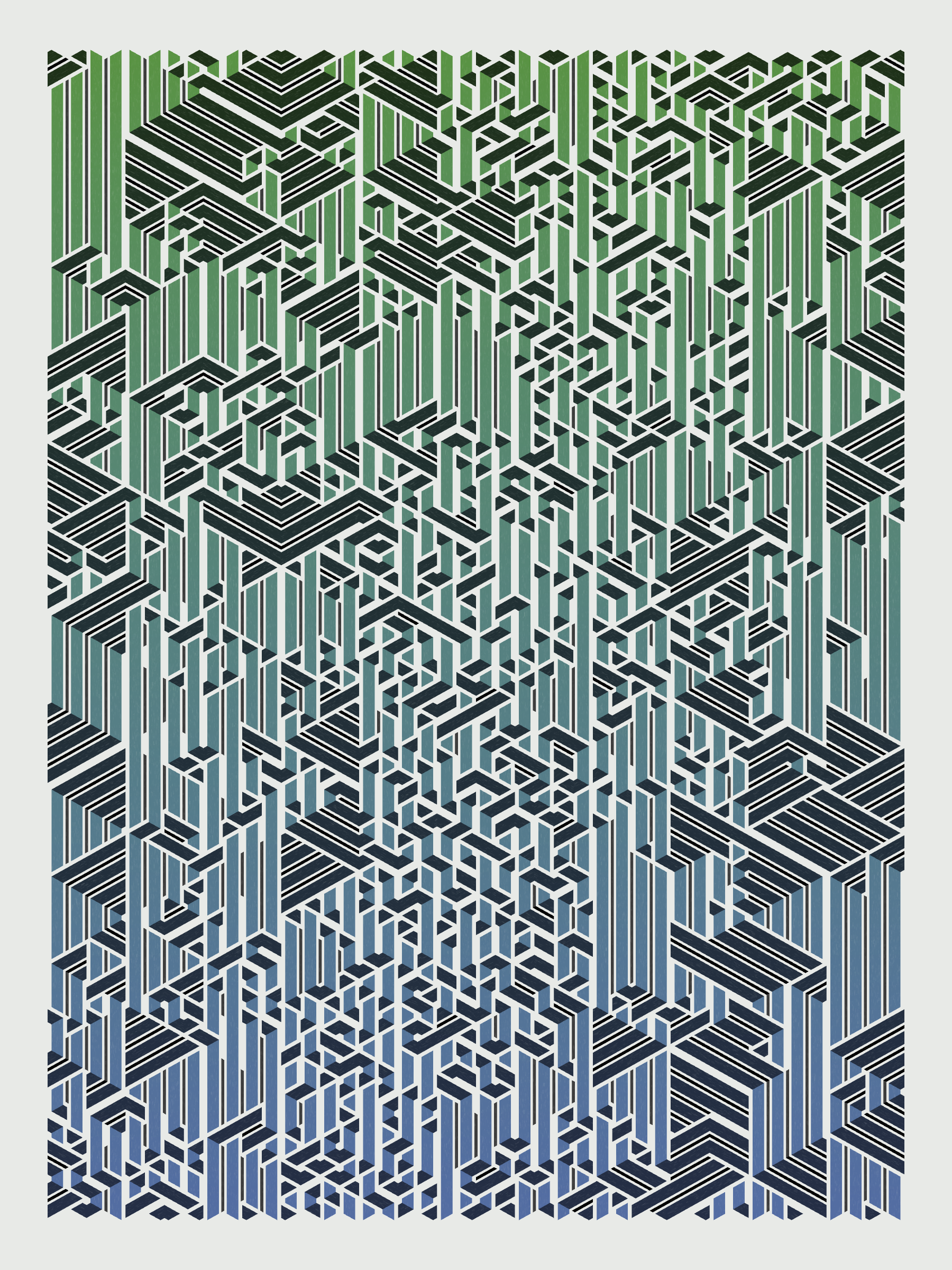 Lines are bent and shaded. There are no wrong turns. [Interaction in live view: press 1-7 or left/right arrow keys to see the stages of sketch construction: 1-grid, 2-divide, 3-tile, 4-bend, 5-shade, 6-color, 7-texture]