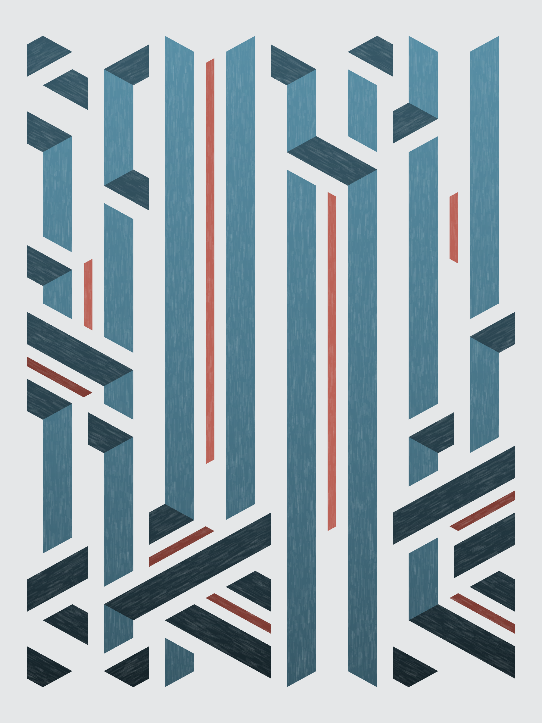 Lines are bent and shaded. There are no wrong turns. [Interaction in live view: press 1-7 or left/right arrow keys to see the stages of sketch construction: 1-grid, 2-divide, 3-tile, 4-bend, 5-shade, 6-color, 7-texture]