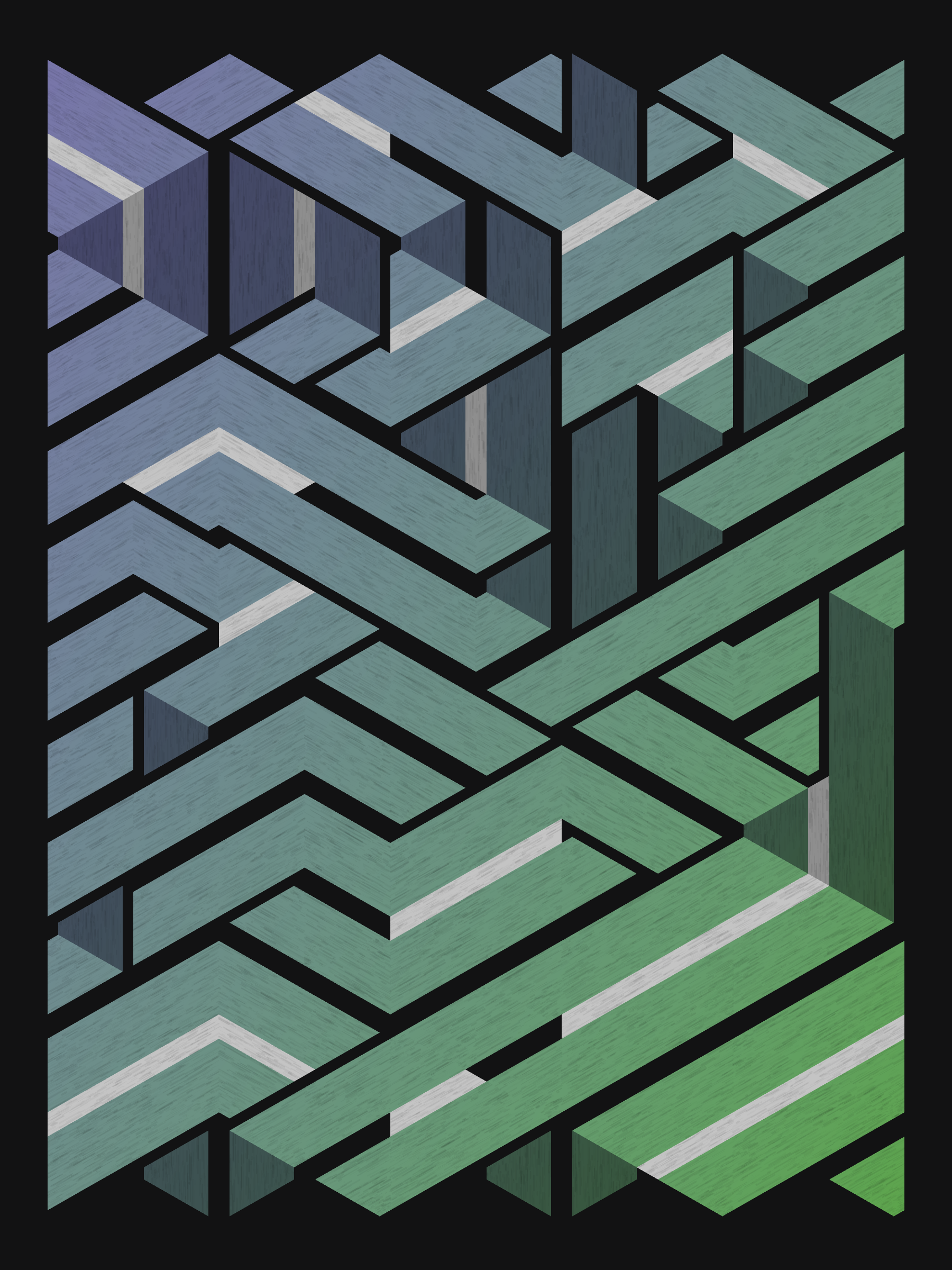 Lines are bent and shaded. There are no wrong turns. [Interaction in live view: press 1-7 or left/right arrow keys to see the stages of sketch construction: 1-grid, 2-divide, 3-tile, 4-bend, 5-shade, 6-color, 7-texture]