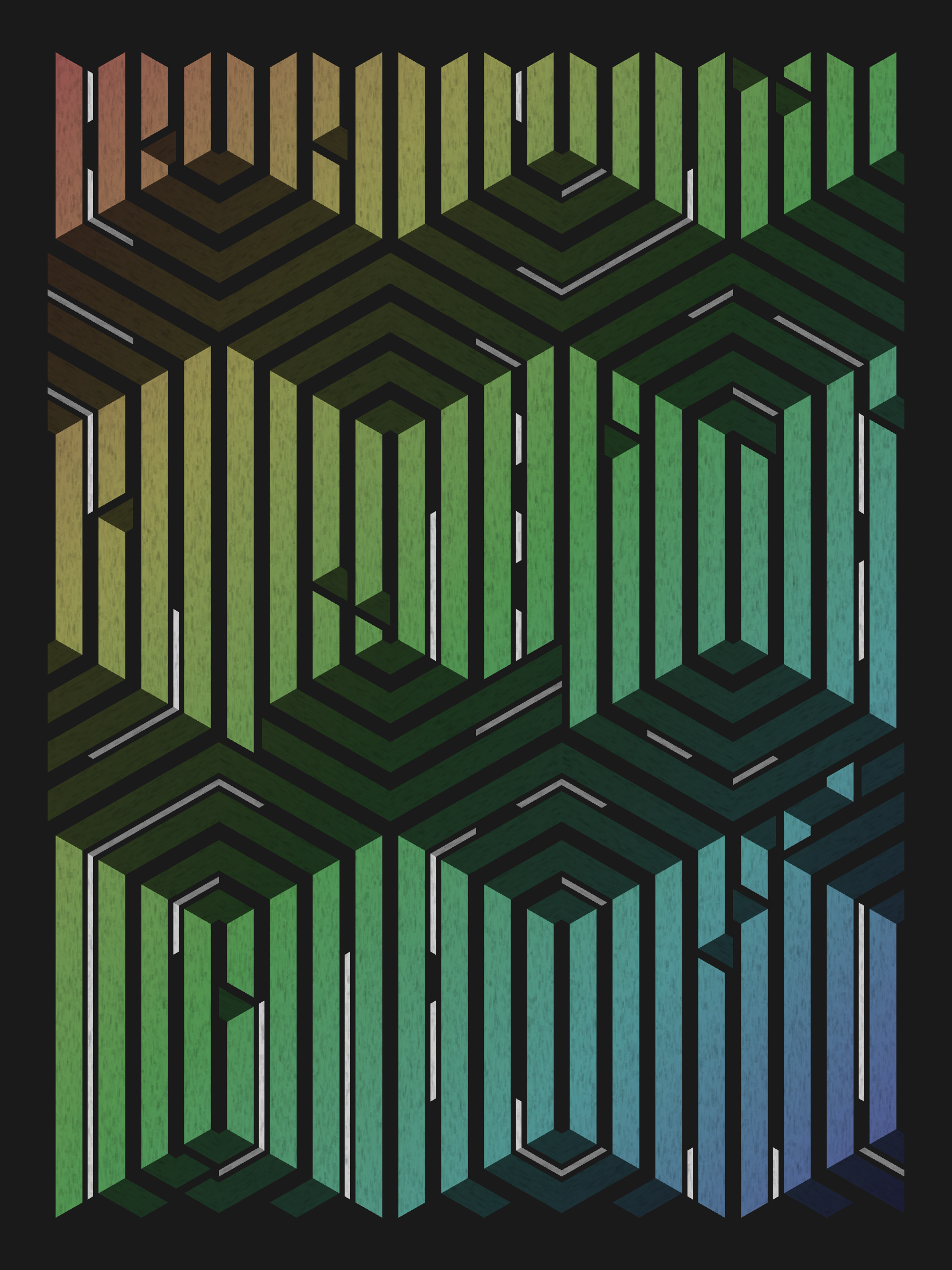 Lines are bent and shaded. There are no wrong turns. [Interaction in live view: press 1-7 or left/right arrow keys to see the stages of sketch construction: 1-grid, 2-divide, 3-tile, 4-bend, 5-shade, 6-color, 7-texture]