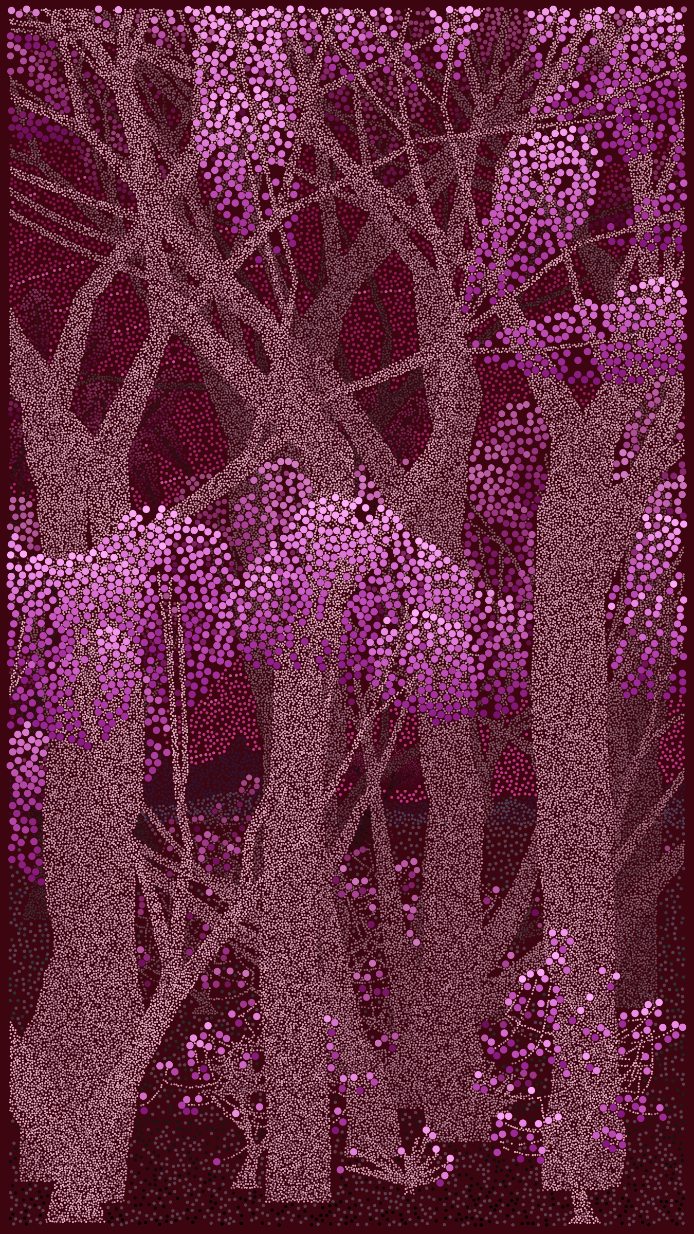 The algorithm is made up of a system that uses a mix of circle-packing and quadtrees to fill areas of closed shapes with dots of different sizes and colors (like the chochitos). The underlying form of the composition is generated algorithmically using shapes constructed on the fly using points and lines. The shapes are lined up in a queue and then swept for possible areas where dots can be deposited so long as the dots do not overlap.
